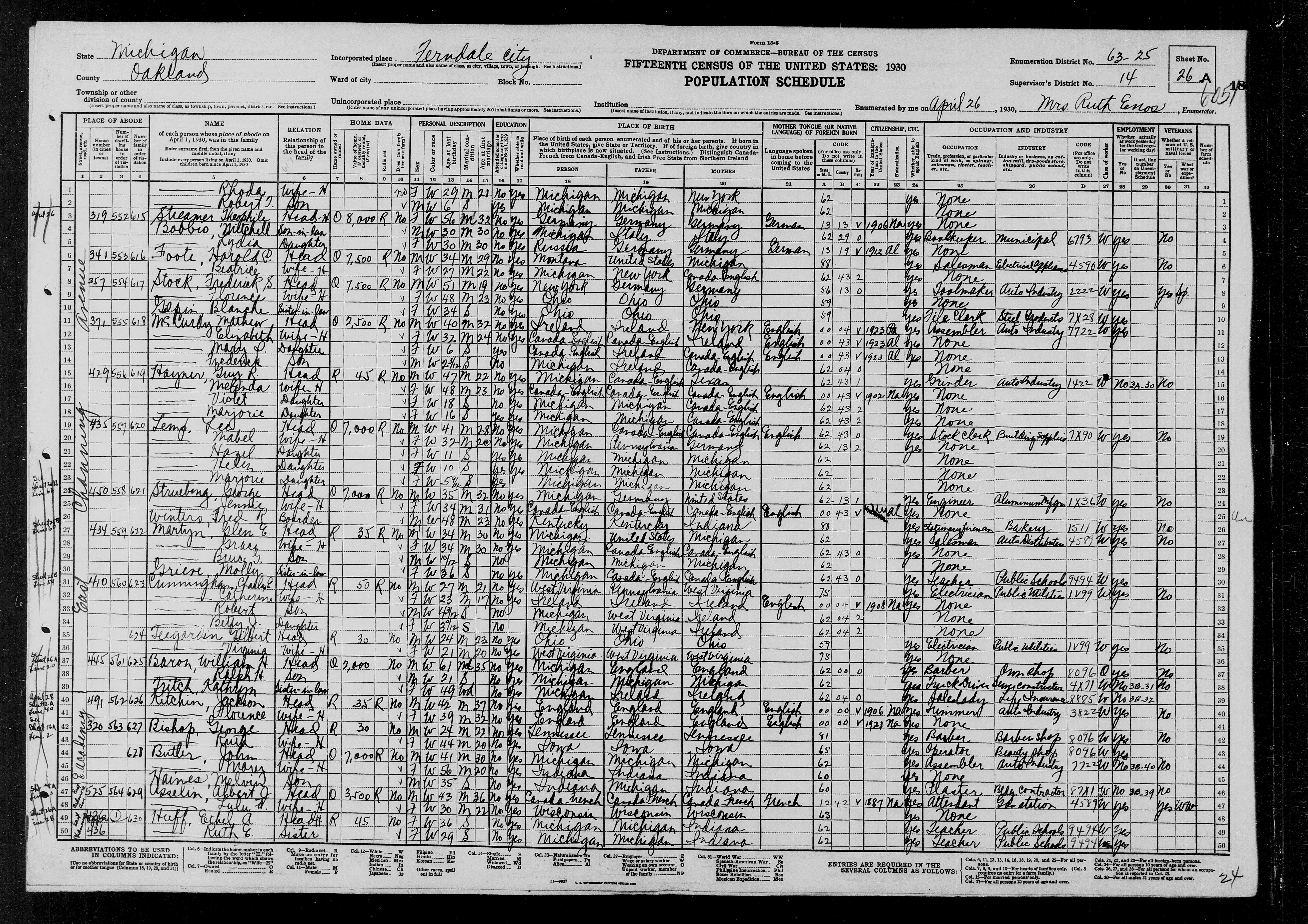 12. He appeared on the 1930 United States census on 26 April 1930 in Ferndale, Oakland, Michigan, United States. 1930_MI_Oakland_63-25_14_26a 13. He resided at 434 East Channey Avenue on 26 April 1930 in Ferndale, Oakland, Michigan, United States. This event was shared with Bruce Glenn MARTYN (1929-), Grace L. GRIEVE (1895-1990), and Mollie J. GRIEVE (1893-1991). 14. He resided at 317 Peck Street on 1 April 1935 in Sault Ste. Marie, Chippewa, Michigan, United States. According to the 1940 census, Glenn, Grace and Bruce resided in the same place five years earlier. This event was shared with Bruce Glenn MARTYN (1929-) and Grace L. GRIEVE (1895-1990).