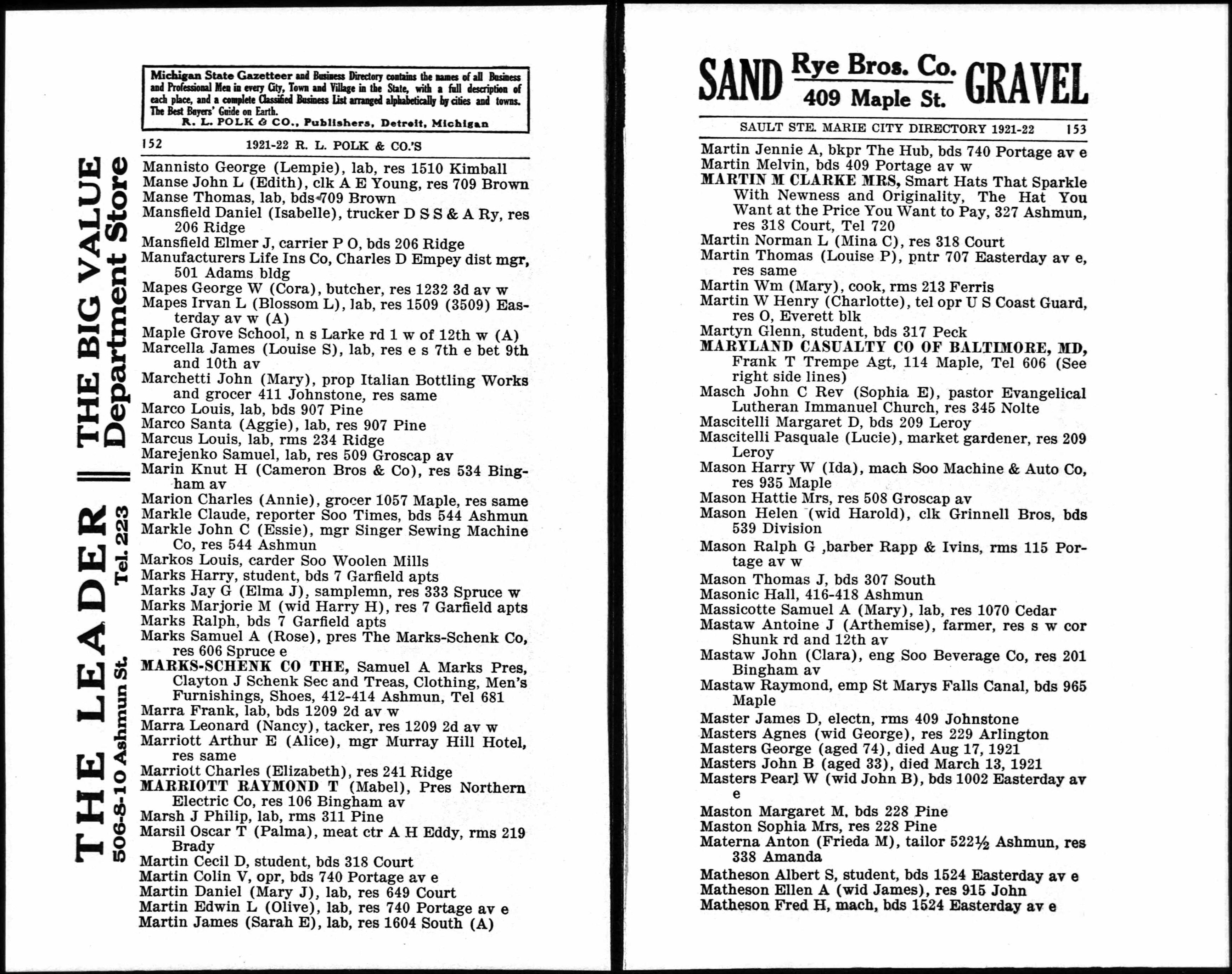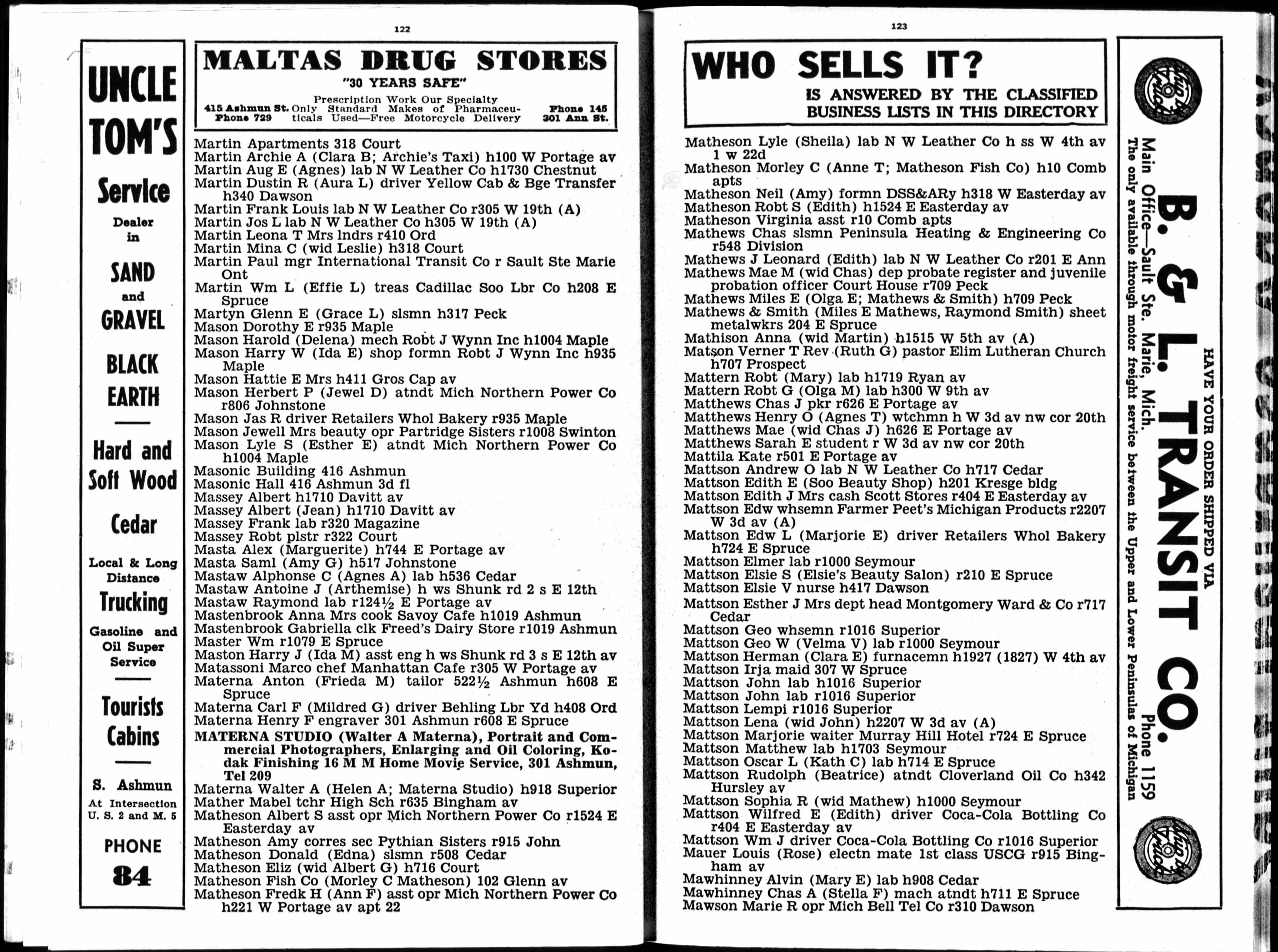 20. City Directory: Polk's Sault Ste. Marie City Directory, page 127, in 1952, in Sault Ste. Marie, Chippewa, Michigan, United States. Martyn Barbara r319 Peck 21. He worked as a Salesman, Harrington Nash in 1952 in Sault Ste. Marie, Chippewa, Michigan, United States. 22. He resided at 319 Peck Street in 1952 in Sault Ste. Marie, Chippewa, Michigan, United States. This event was shared with Grace L. GRIEVE (1895-1990).