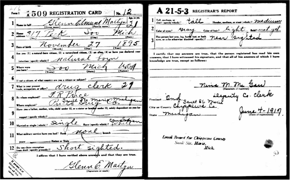 Cause of his death was Apparent Heart Attack. Another name for Glenn was William Edmund Glenn MARTYN. FamilySearch ID: LJKW-32J General Notes: Additional Photos Birth Notes: November 30, 1895 Page 2 Christening Notes: The Sault Ste. Marie News (The Democrat) Burial Notes: