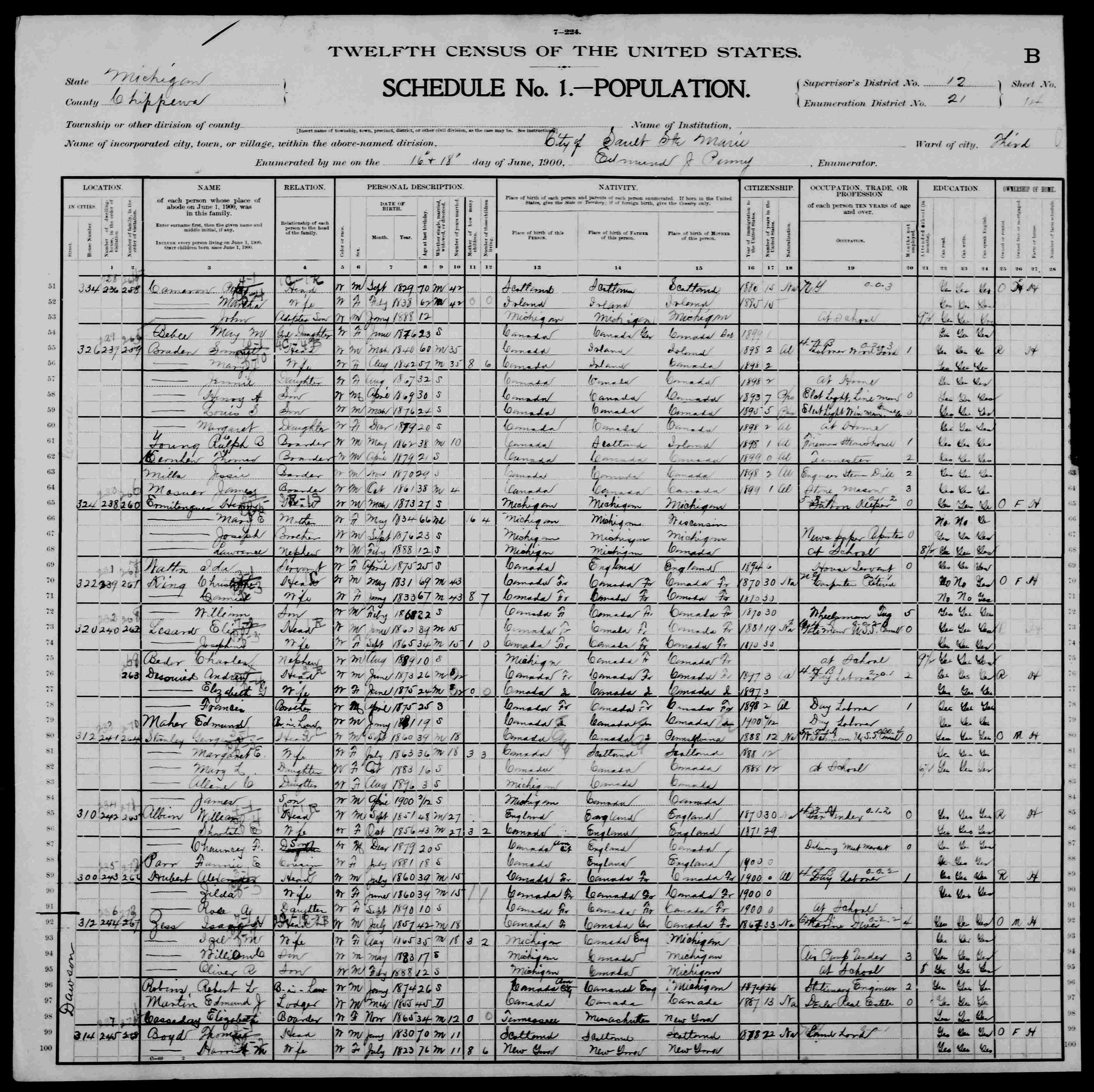 20. He appeared on the 1900 United States census on 16 June 1900 in Sault Ste. Marie, Chippewa, Michigan, United States. 111 Edmund J. Martin was listed as a "Lodger" on Dawson. According to the listing, he was age 45 and divoriced. His birth month and year were listed as Feb 1855. His birthplace was listed as Canada and he immigrated to the United States in 1887 and had resided in the U.S. for 13 years.
