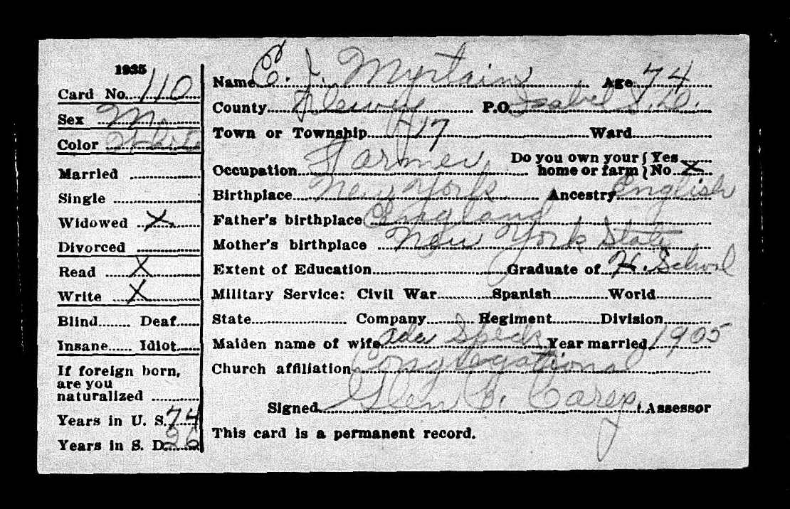 In township 17, range 22. Edmund was listed as a widower and was living with his daughter Virginia. This event was shared with Virginia Jean MARTYN (1914-2011).