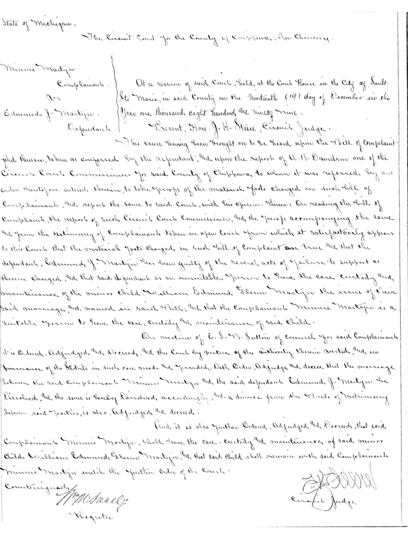 3. Divorced: Minnie Martyn, Complainant vs. Edmund J. Martyn, Defendant, 19 December 1899, Sault Ste. Marie, Chippewa, Michigan, United States. 124