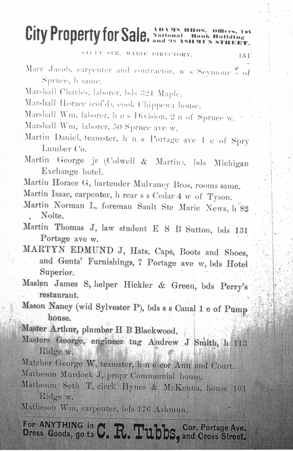 22. Edmund Jonathan Martyn appeared in Sault Ste. Marie, Chippewa, Michigan, United States City Directory for 1901 page 157.