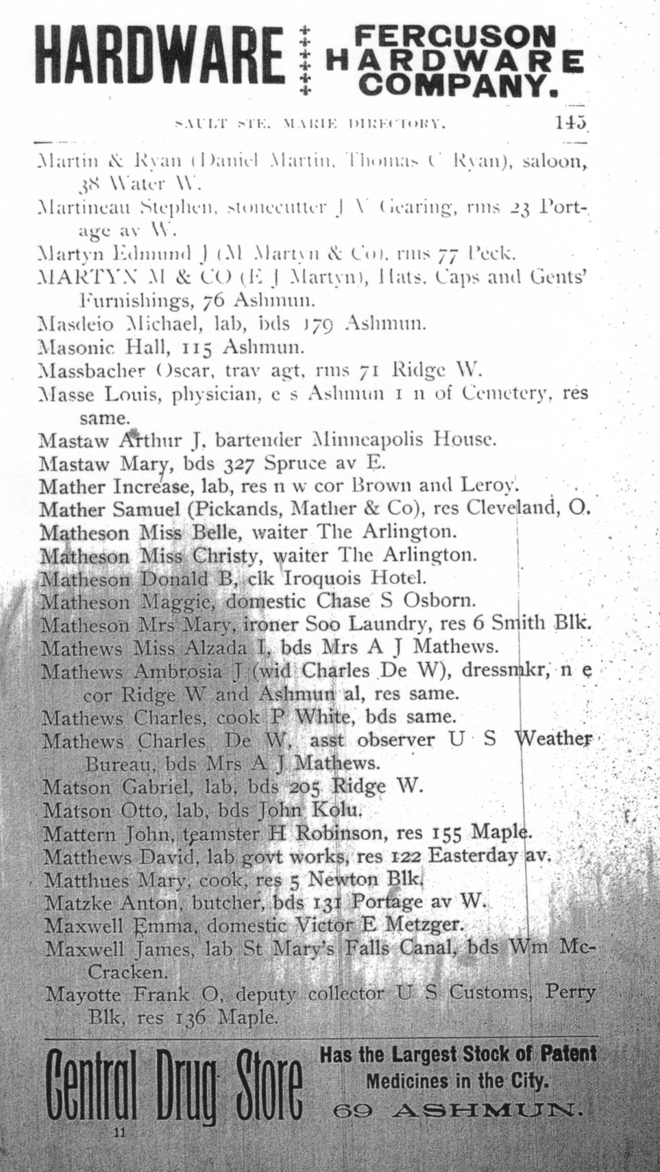 17. Edmund Jonathan Martyn appeared in Sault Ste. Marie, Chippewa, Michigan, United States City Directory for 1896 108 page 145.