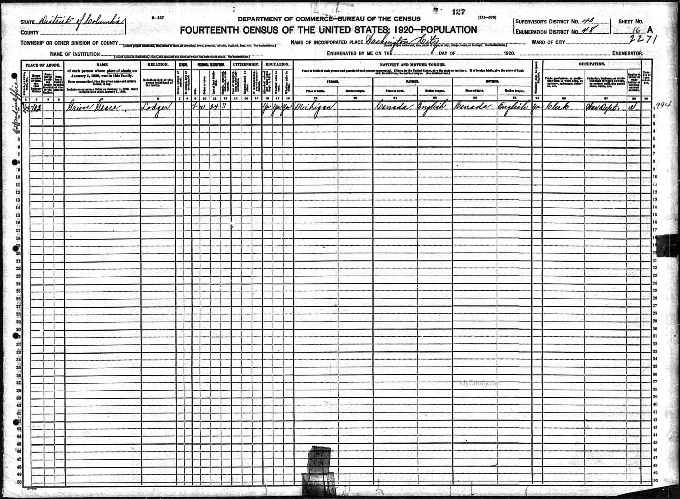 6. She appeared on the 1920 United States census on 21 January 1920 in Washington, District of Columbia, District of Columbia, United States. 1920_DC_Washington_40_48_16a 7. She had a residence on 21 January 1920 in Washington, District of Columbia, District of Columbia, United States. 12 8. She had a residence on 8 September 1926 in Sault Ste. Marie, Chippewa, Michigan, United States. 9. She appeared in the household of Glenn Edmund MARTYN in the 326 Withington Avenue census on 26 September 1927 in Ferndale, Oakland, Michigan, United States. This event was shared from Glenn Edmund MARTYN who also shared it with Grace L. GRIEVE (1895-1990) and Sherly Jane MARTYN (1927-1927).