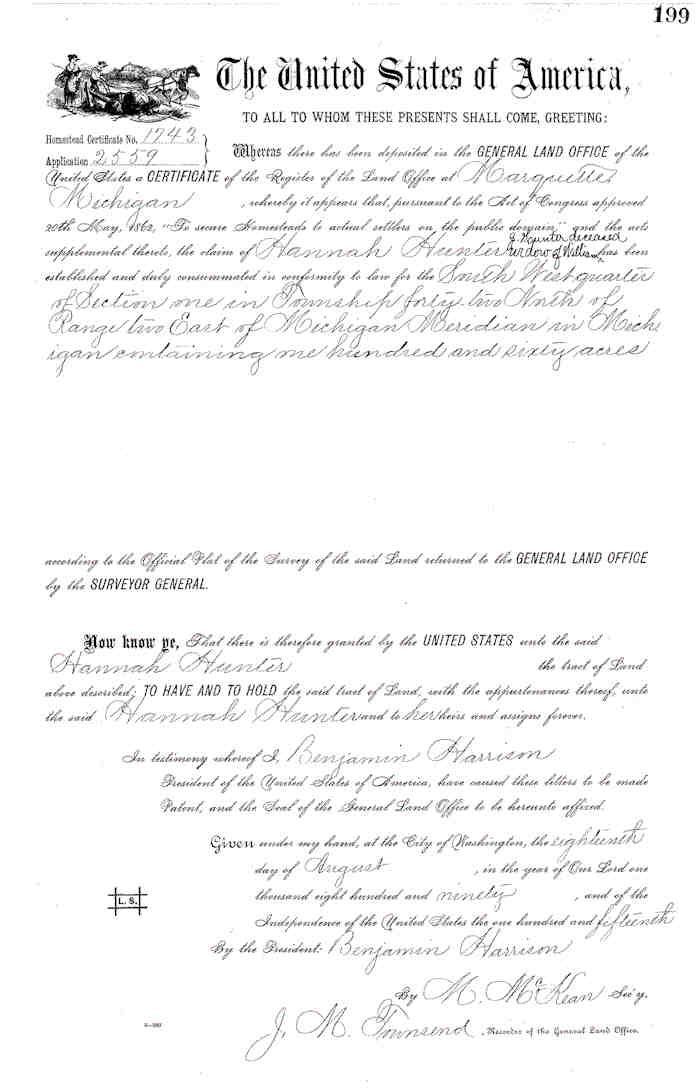 9. She owned land acquired via the Homestead Act of 1862 on 18 August 1890 in , Chippewa, Michigan, United States. South west quarter of section one in Township forty-two, north of range two, east of Michigan Meridian in Michigan. Containing one hundred and sixty acres.