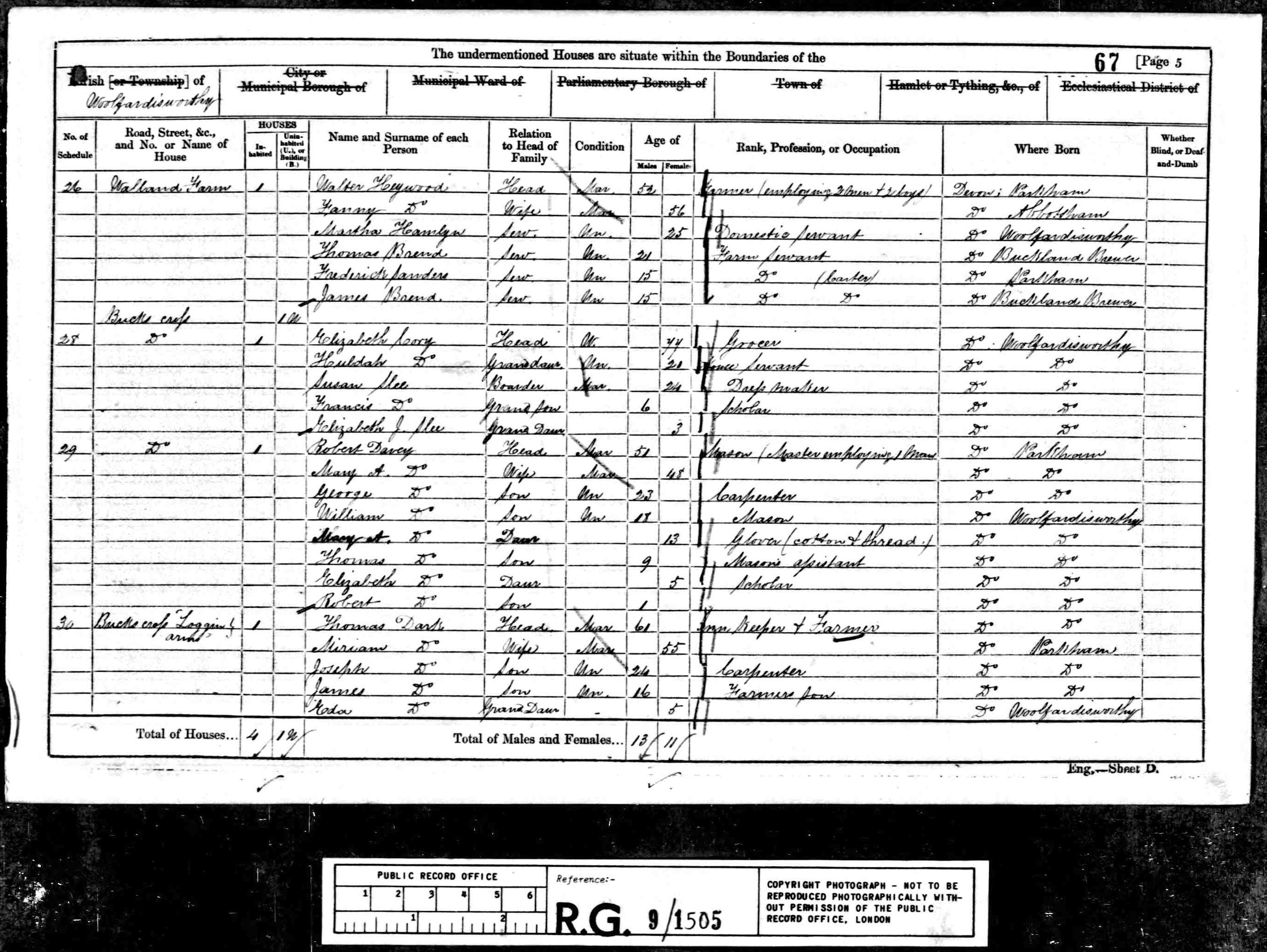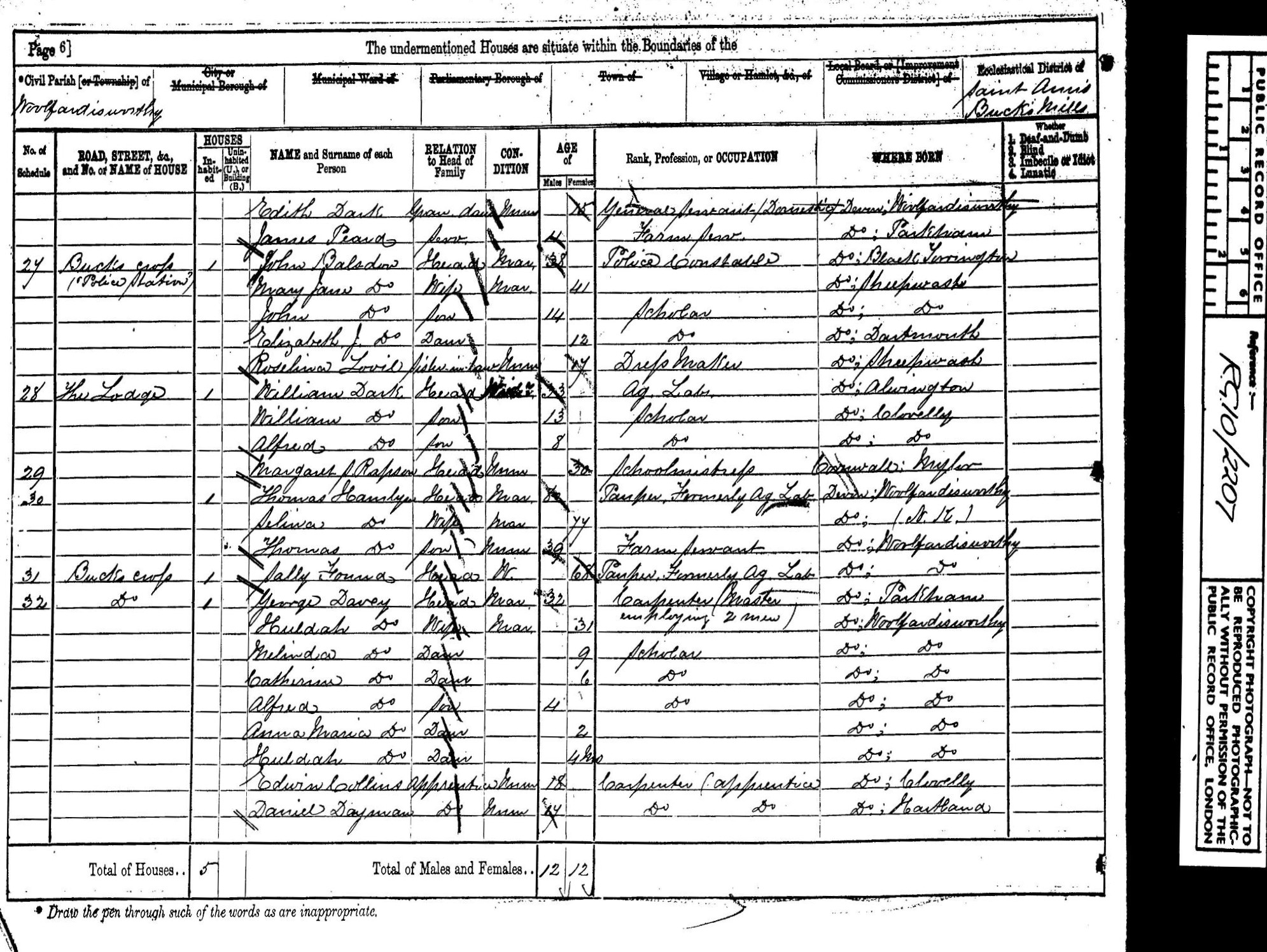 11. He appeared on the 1891 British census on 5 April 1891 in Woolfardisworthy, , Devonshire, England. 197 Registration District No. : 287, Enumeration Dist. No. 5, Folio 52, Page 6, Sched. 32 12. He worked as a Carpenter(Em'er) on 5 April 1891 in Woolfardisworthy, , Devonshire, England. 198 13. He resided at Bucks Cross on 5 April 1891 in Woolfardisworthy, , Devonshire, England. 198 This event was shared with George Thomas DAVEY (1872-1943) and Huldah CORY (1839-1910).