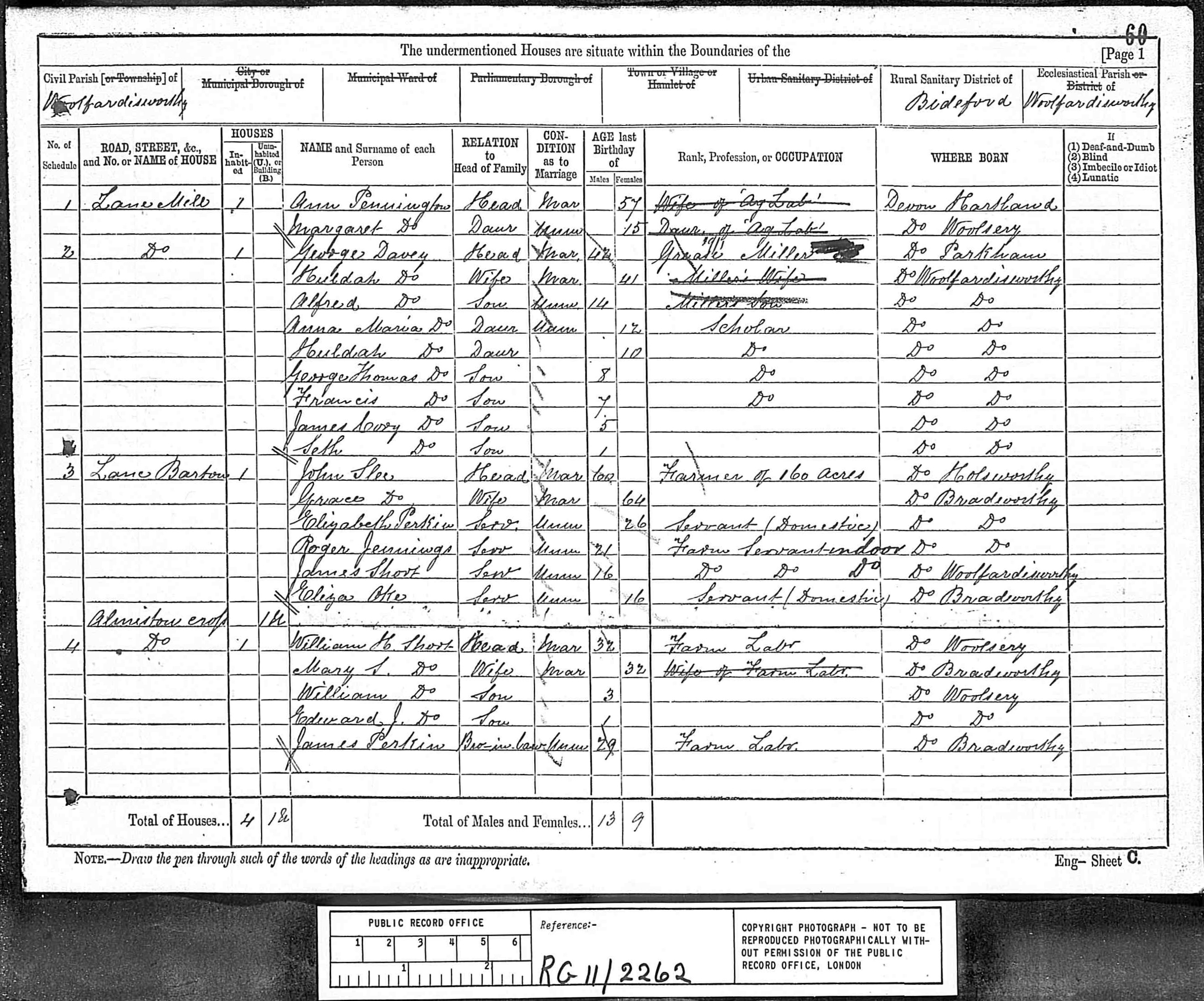 8. He appeared on the 1881 British census on 3 April 1881 in Woolfardisworthy, , Devonshire, England. 196 9. He worked as a Grease Miller on 3 April 1881 in Woolfardisworthy, , Devonshire, England. 192 10. He resided at Lane Mill on 3 April 1881 in Woolfardisworthy, , Devonshire, England. 192 This event was shared with Alfred DAVEY (1866-), Anna Maria DAVEY (1868-1959), Francis DAVEY (1874-), George Thomas DAVEY (1872-1943), Huldah CORY (1839-1910), Huldah DAVEY (1870-1946), James Cory DAVEY (1876-), and Seth DAVEY (1879-).