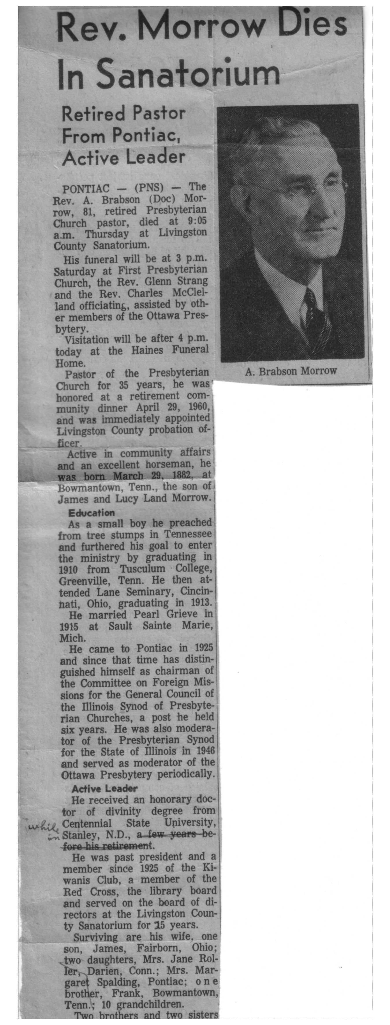 PONTIAC - The Rev. A. Brabson (Doc) Morrow, 81, retired Presbyterian Church pastor, died at 9:05 A.M. Thursday at Livingston County Sanatorium.