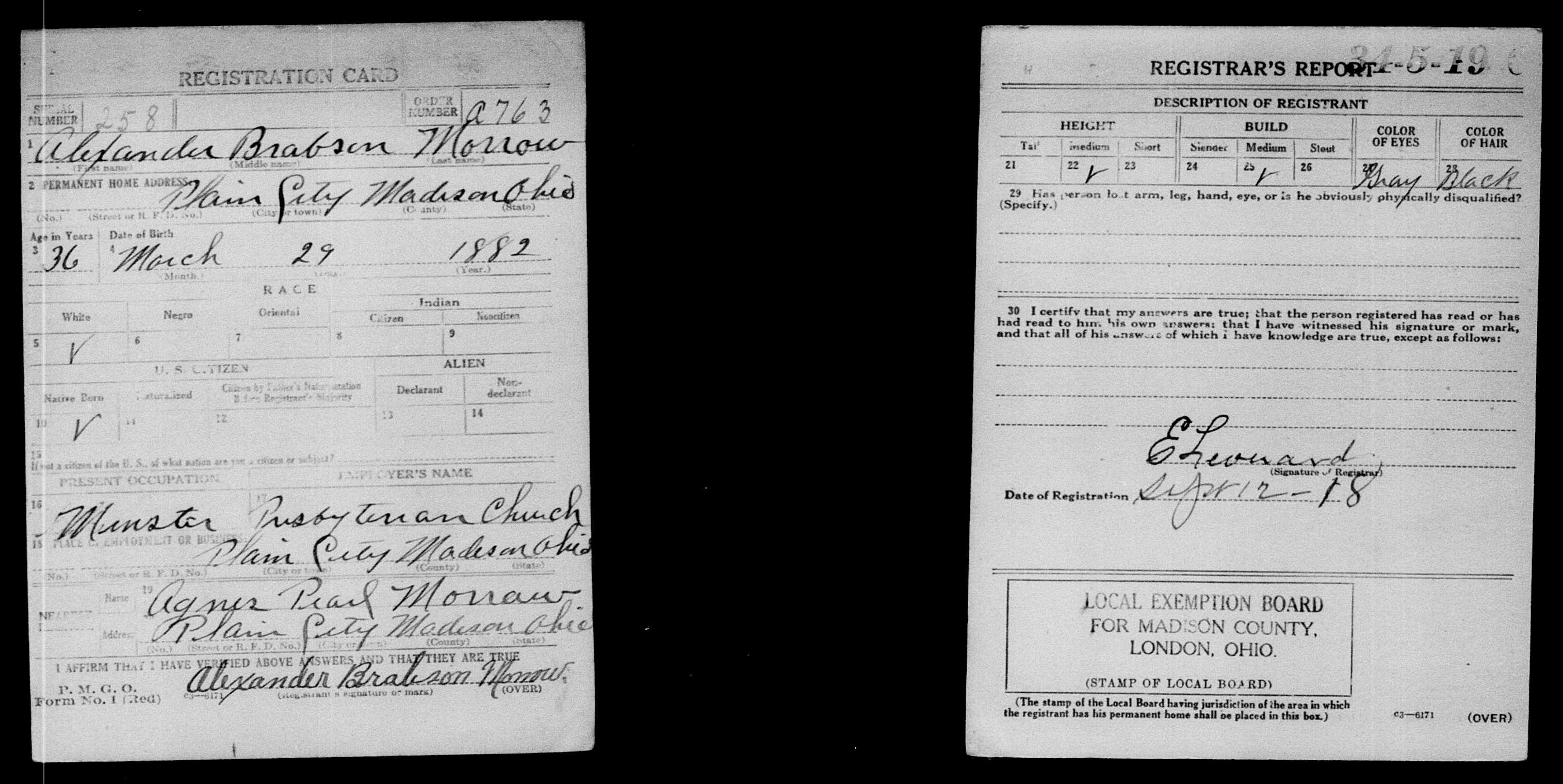 2. Alexander served in the military on 12 September 1918 in London, Madison, Ohio, United States: WWI Registration Card.