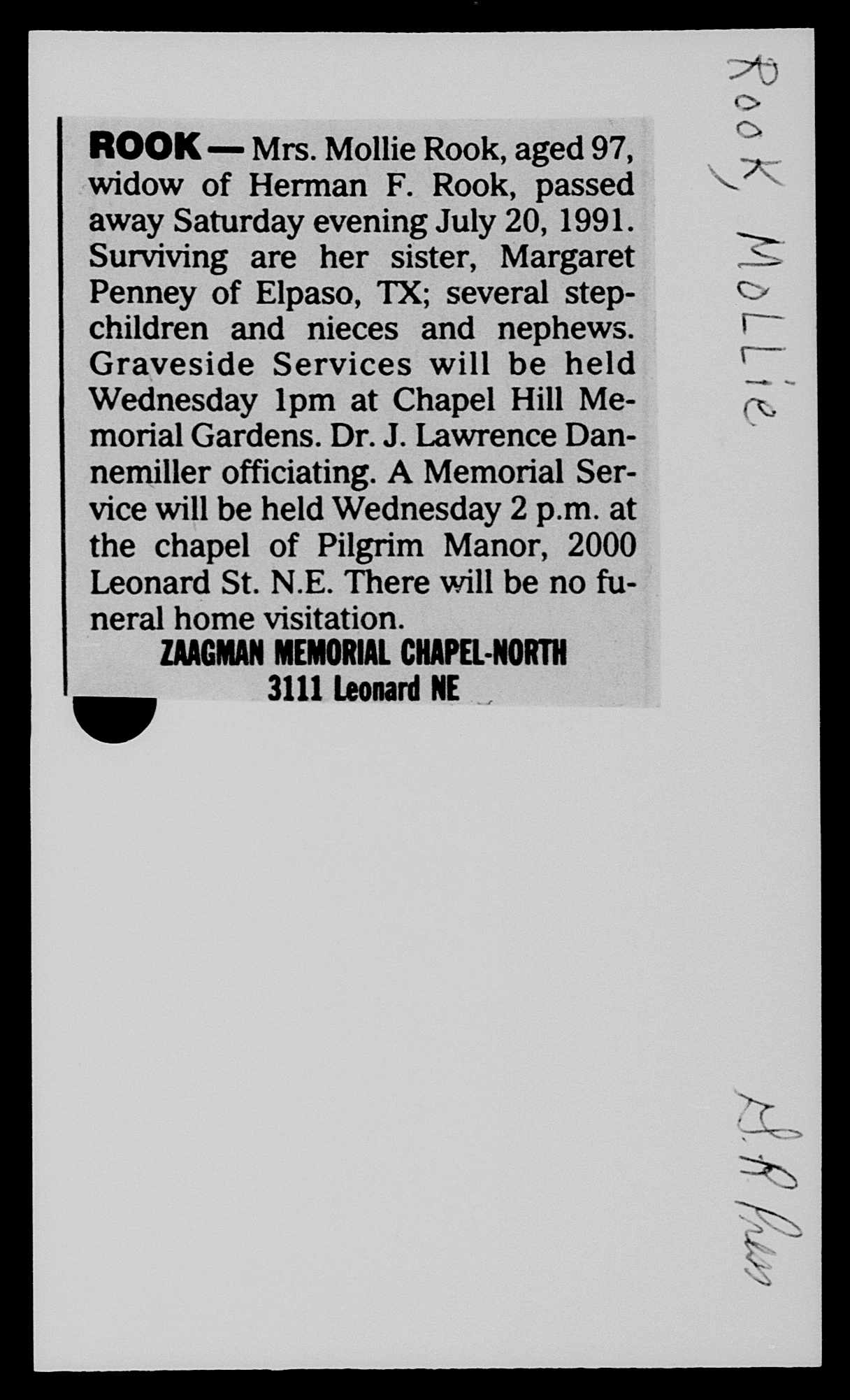 15. Her obituary was published in the Grand Rapids Press on 22 July 1991 in Grand Rapids, Kent, Michigan, United States. Mollie married Herman Friedrich ROOK, son of Friederich August ROOK and Bertha Laura ZELZ, on 22 June 1943 in Royal Oak, Oakland, Michigan, United States.27 (Herman Friedrich ROOK was born on 16 March 1886 in Postelau, , Gdansk, Poland,28 died on 13 February 1961 in Caledonia, Kent, Michigan, United States 28 and was buried in February 1961 in Grand Rapids, Kent, Michigan, United States 29.) Noted events in their marriage were: 1. Marriage Record: Marriage License 713 - 1943, 17 June 1943, Royal Oak, Oakland, Michigan, United States. |