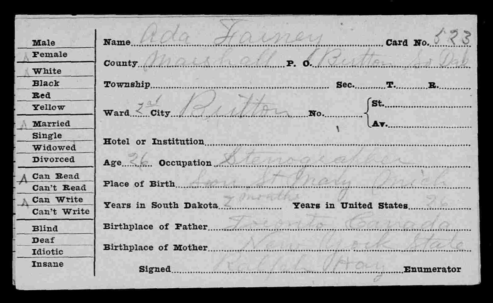 7. She appeared on the 1905 South Dakota State census in 1905 in Britton, Marshall, South Dakota, United States. Name: Ada Farney 8. She worked as a Stenographer on 2 April 1907.