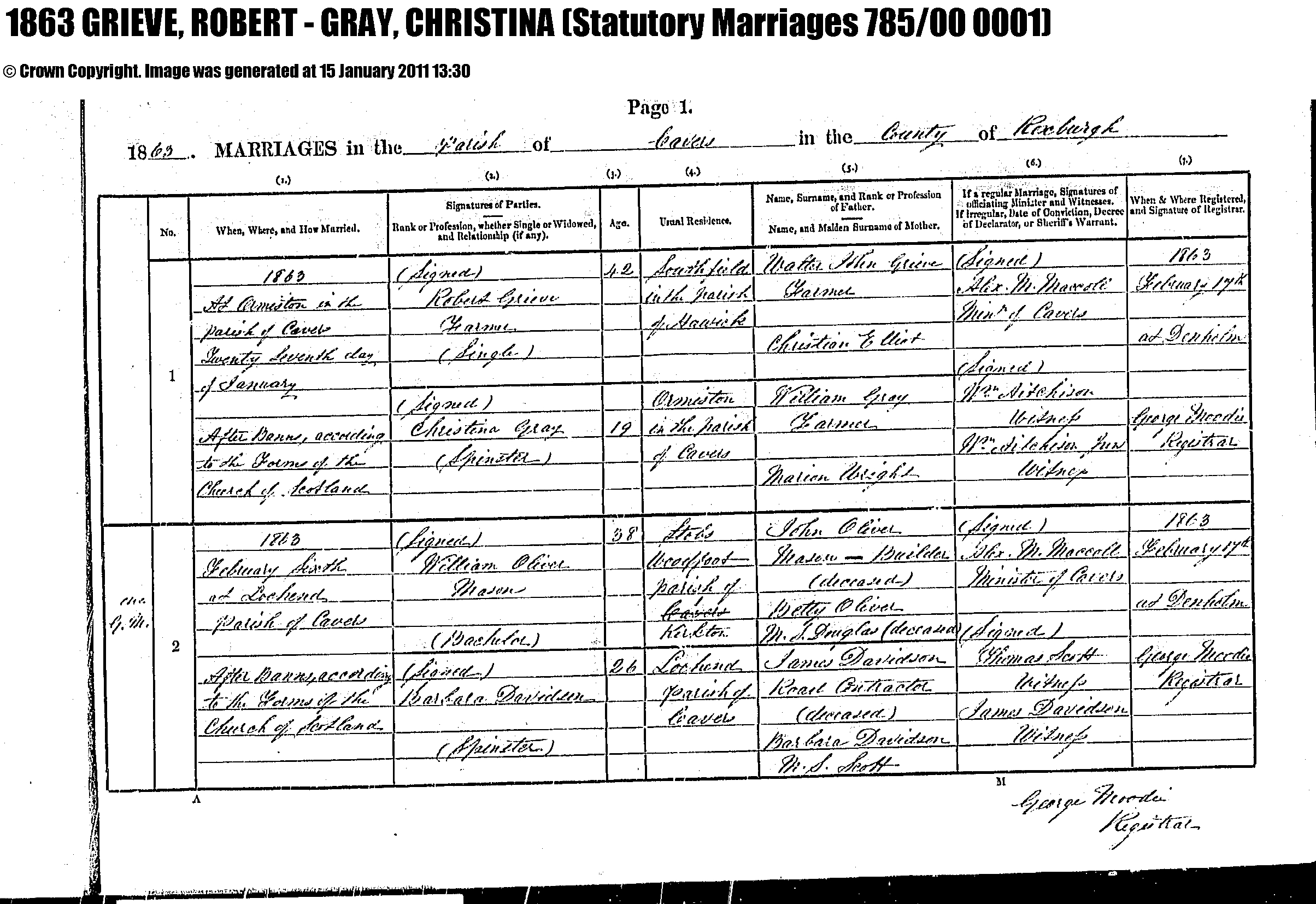 1. Marriage Record: Statutory Marriages 785/00 0001, 27 January 1863, Hawick, , Roxburgh, Scotland. Marriage Notes: Cavers |