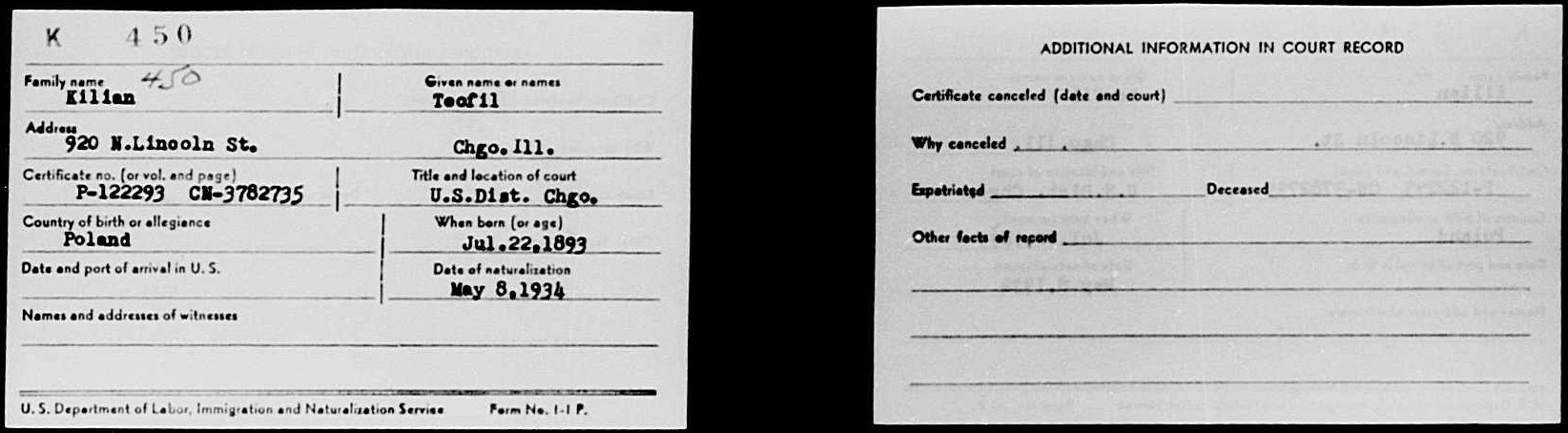 10. He was naturalized on 8 May 1934 in Chicago, Cook, Illinois, United States. 973 Teofil Kilian 11. He resided at 920 Wolcott Avenue in 1935 in Chicago, Cook, Illinois, United States. Same house based on 1940 Census. This event was shared with Anna KILIAN (1924-), Henry J. KILIAN (1932-2011), and Victoria SIVEK (1900-1971).