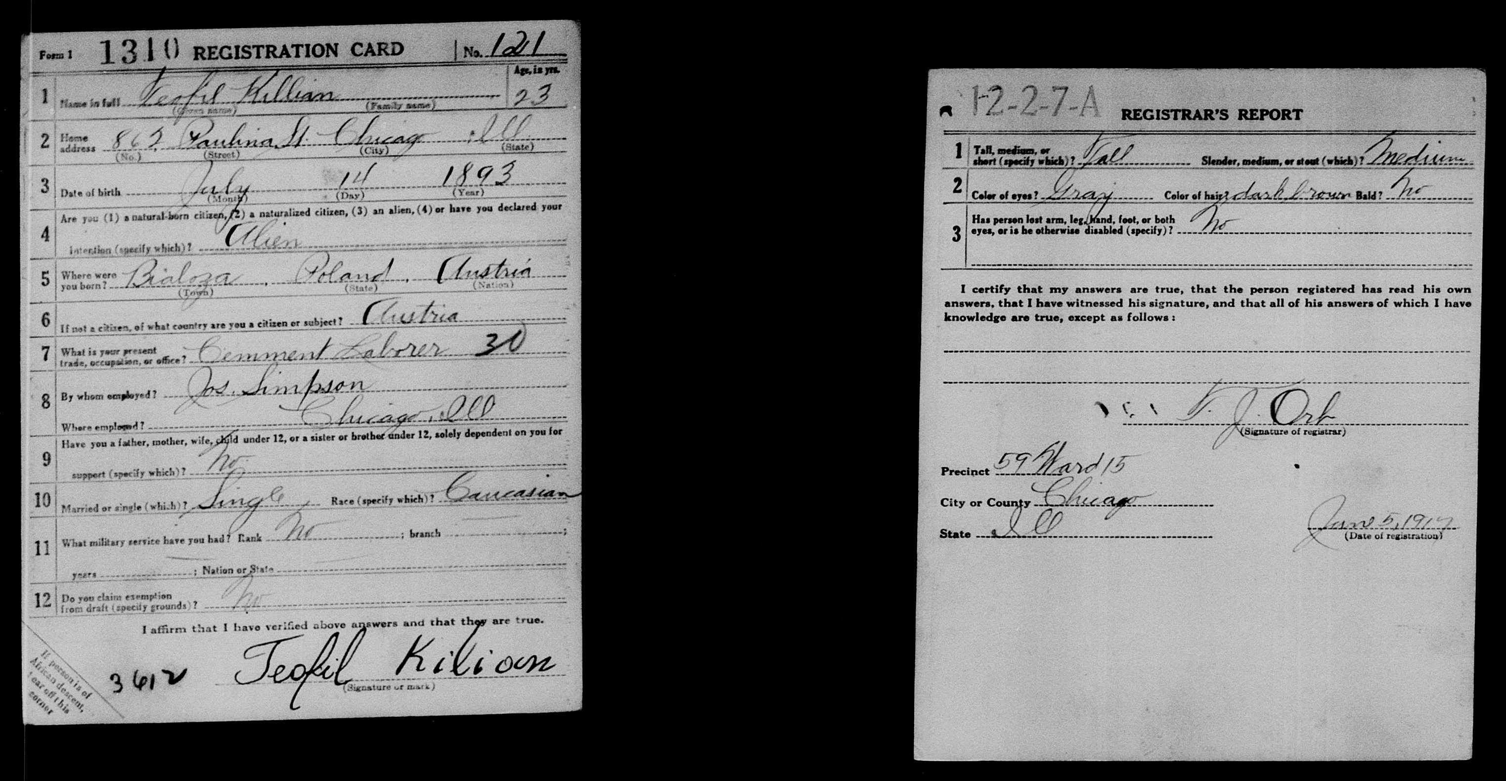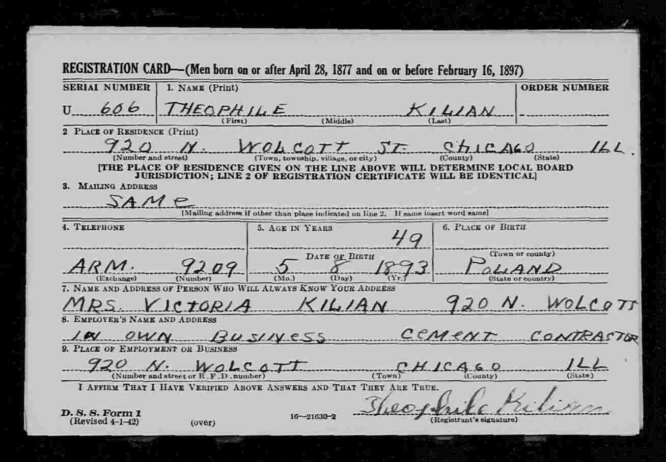 5. Draft Registration: WWI, 5 June 1917, Chicago, Cook, Illinois, United States. Teofil was described as tall, medium build with gray eyes and dark brown hair. 6. He resided at 862 Paulina Street on 5 June 1917 in Chicago, Cook, Illinois, United States.
