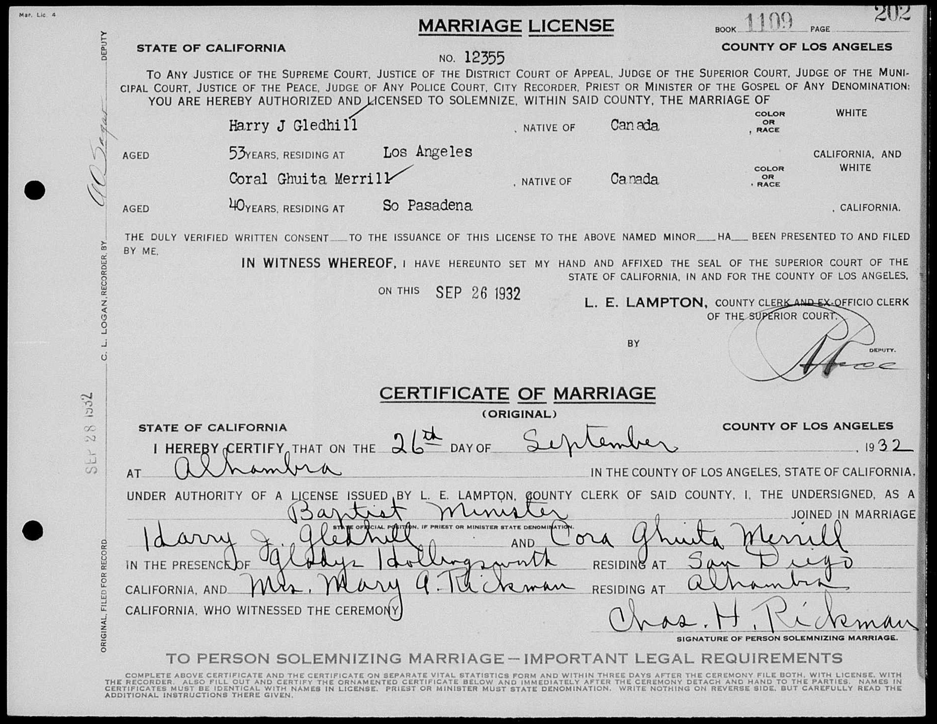 1. Harry and Coral obtained a marriage license on 26 September 1932 in Alhambra, Los Angeles, California, United States. |