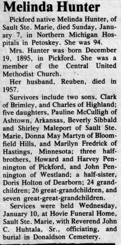 Pickford native, Melinda Hunter, of Sault Ste. Marie, died Sunday, January 7, in Northern Michigan Hospitals in Petosky. She was 94. Mrs. Hunter was born December 19, 1895, in Pickford. She was a member of the Central United Methodist Church. Her husband, Reuben, died in 1957. Survivors include two sons, Clark of Brimley, and Charles of Highland; five daughters, Pauline McCulligh of Ashtown, Arkansas, Beverly Sibbald and Shirley Maleport of Sault Ste. Marie, Donna May Martyn of Bloomfield Hills, and Marilyn Fredrick of Hastings, Minnesota; three half-brothers, Howard and Harvey Pennington of Pickford, and John Pennington of Westland; a half-sister, Doris Holton of Dearborn; 24 grandchildren; 26 great-grandchildren, and seven great-great-grandchildren. Services were held Wednesday, January 10, at Hovie Funeral Home, Sault Ste. Marie, with Reverend John C. Huhtala, Sr., officiating, and burial in Donaldson Cemetery.