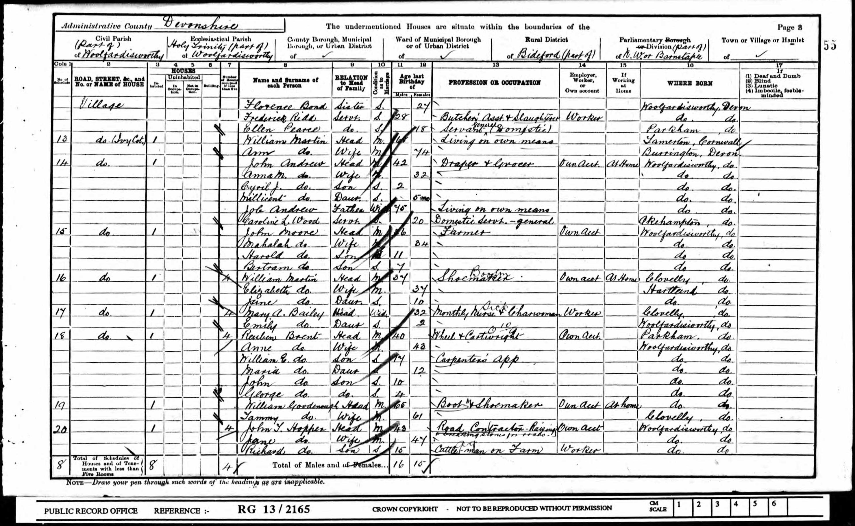 7. She appeared in the household of John ANDREW in the 1911 British census on 2 April 1911 in Woolfardisworthy, , Devonshire, England. Street Address Post Office, Woolsery