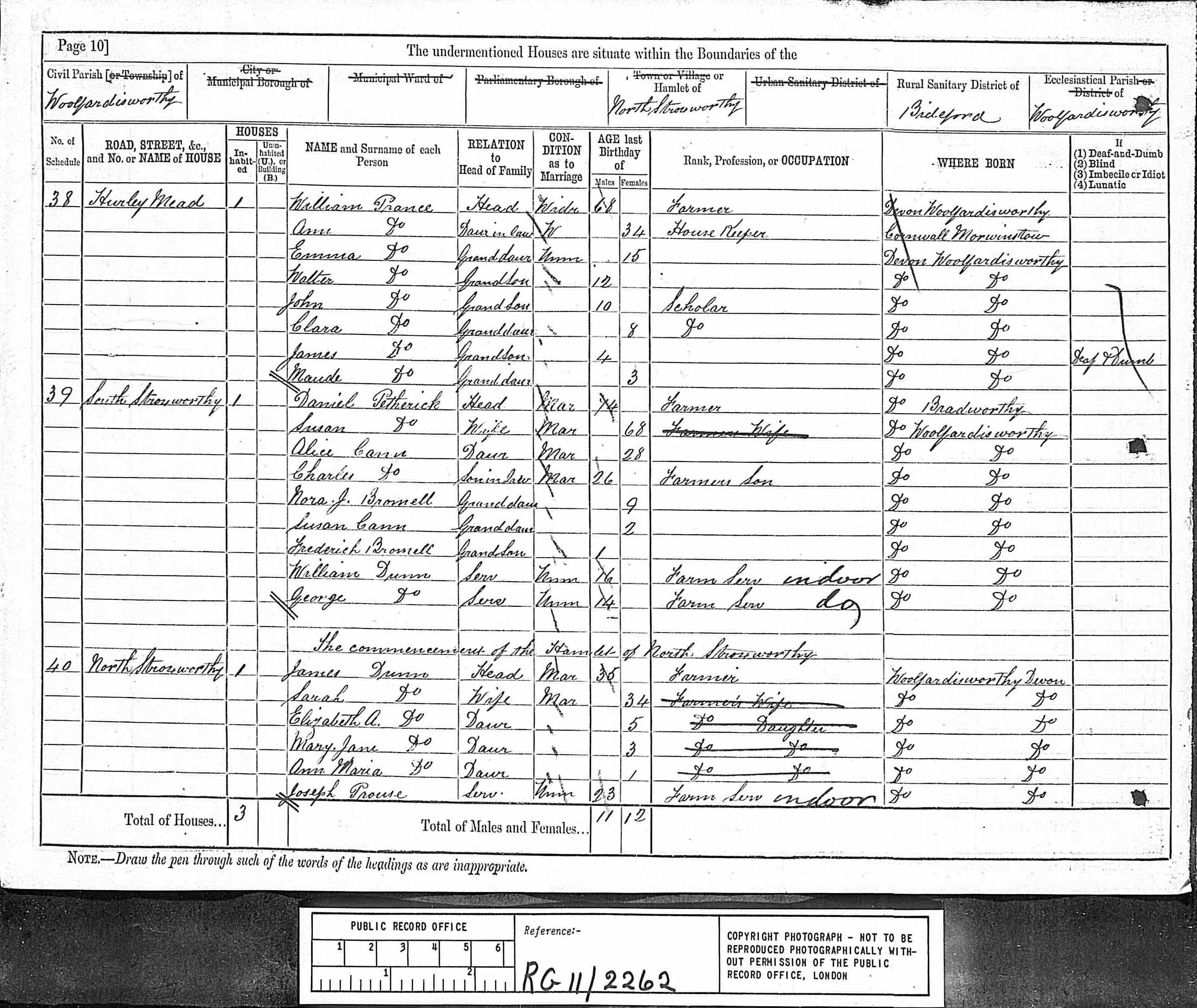 1. Anna appeared in the household of James DUNN in the 1881 British census on 3 April 1881 in Woolfardisworthy, , Devonshire, England. 226 226 This event was shared from James DUNN who also shared it with Anna Maria DUNN (1880-), Elizabeth Ann DUNN (Abt 1877-), Mary Jane DUNN (1878-1925), and Sarah HEYWOOD (Abt 1847-). 2. She was an occupant at the residence of James DUNN on 3 April 1881 in Woolfardisworthy, , Devonshire, England: North Strosworthy. 226 226 This event was shared from James DUNN who also shared it with Anna Maria DUNN (1880-), Elizabeth Ann DUNN (Abt 1877-), Mary Jane DUNN (1878-1925), and Sarah HEYWOOD (Abt 1847-).