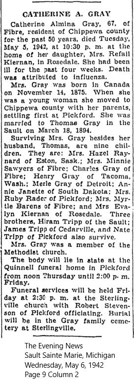 1. Her obituary was published in The Evening News on 6 May 1942 in Sault Ste. Marie, Chippewa, Michigan, United States. Catherine married Thomas GRAY Jr., son of Thomas GRAY Sr. and Mary Jane KERR, on 18 March 1895 in Sault Ste. Marie, Chippewa, Michigan, United States. (Thomas GRAY Jr. was born on 27 November 1861 in Rawdon, Matawinie, Quebec, Canada, died on 30 November 1953 in Pickford, Chippewa, Michigan, United States and was buried on 3 December 1953 in Stirlingville, Chippewa, Michigan, United States.) Noted events in their marriage were: 1. They published an intent to marry Democrat/Sault Ste. Marie News - Page 10 on 23 March 1895 in Sault Ste. Marie, Chippewa, Michigan, United States. Thos. Gray and Miss Mina Tripp, of Stalwart, were married Monday evening at to M.E. parsonage by the Rev. C. M. Thompson. Marriage Notes: Joe and Ann Mateas stood up for them. |
