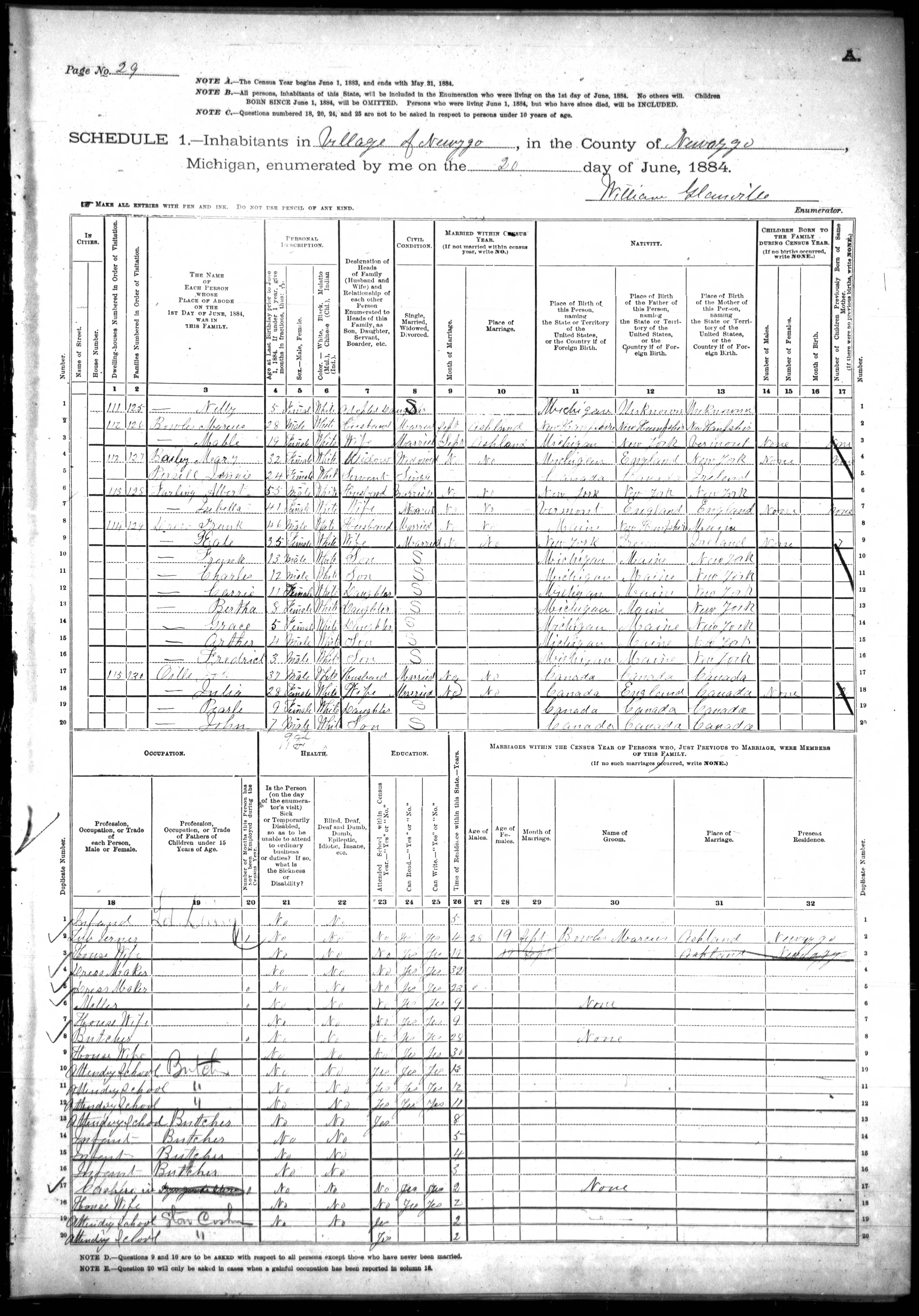 4. Maria appeared in the household of John Lambton OILLE in the 1884 Michigan State census on 20 June 1884 in Newaygo, Newaygo, Michigan, United States. This event was shared from John Lambton OILLE who also shared it with Clifton John OILLE (1876-1919), Julia Athena MARTYN (1856-1932), Maria Theresa MARTYN (1858-1952), and Pearl Maria OILLE (1874-). 5. She was an occupant at the residence of John Lambton OILLE on 20 June 1884 in Newaygo, Newaygo, Michigan, United States: Newaygo, Michigan. This event was shared from John Lambton OILLE who also shared it with Clifton John OILLE (1876-1919), Julia Athena MARTYN (1856-1932), Maria Theresa MARTYN (1858-1952), and Pearl Maria OILLE (1874-). Maria married William George Churcher GRANFIELD, son of George GRANFIELD and Elizabeth, on 17 November 1886 in London, Middlesex, Ontario, Canada.556 (William George Churcher GRANFIELD was born on 23 September 1843 557, christened on 29 December 1843 in Marylebone, , Middlesex, England,557 died on 19 April 1935 and was buried in April 1935 in Glendale, Los Angeles, California, United States.) |