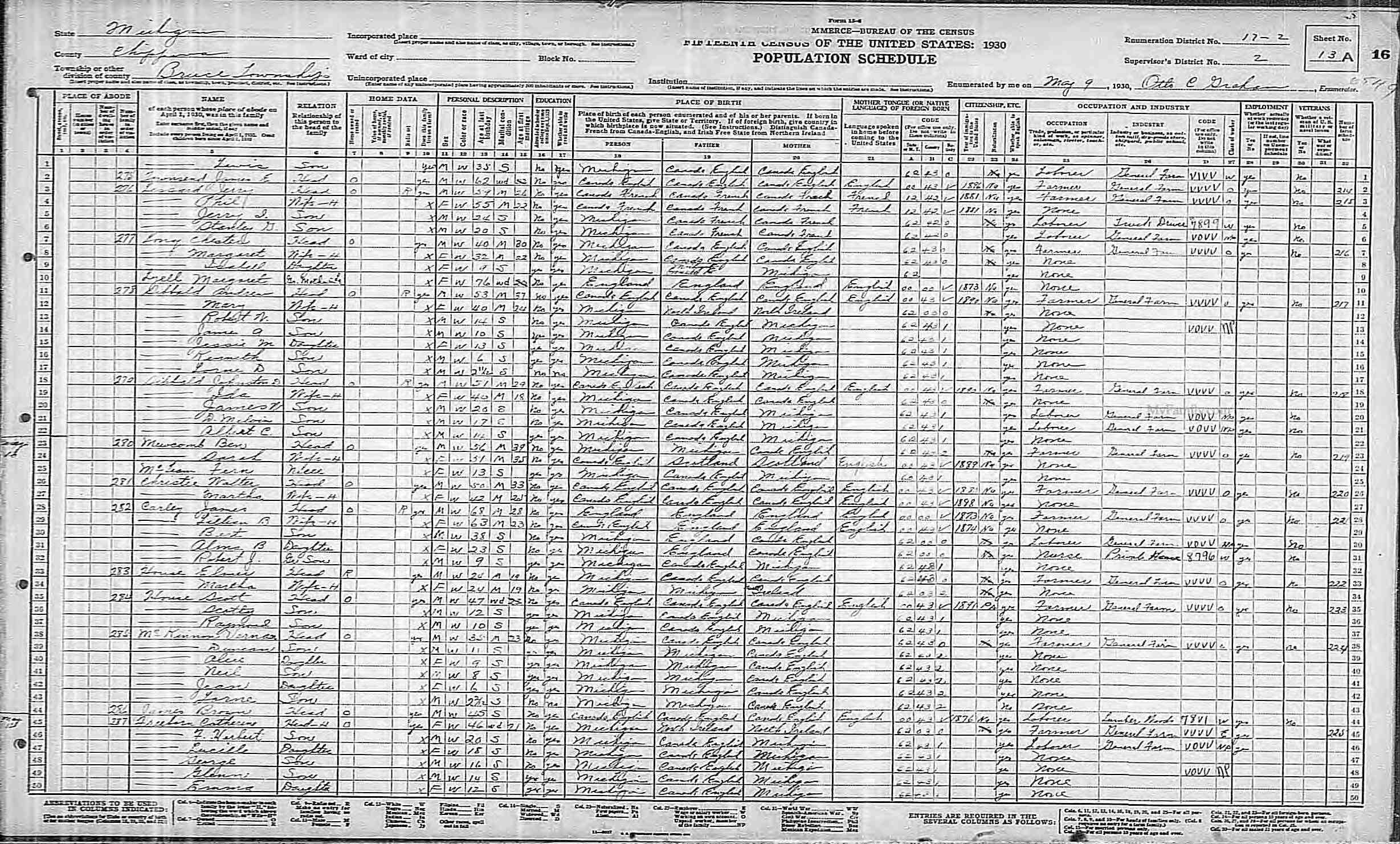1. Mary appeared in the household of Andrew SIBBALD in the 1930 United States census on 9 May 1930 in Bruce Township, Chippewa, Michigan, United States. 1930_MI_Chippewa_17-2_2_13a 2. She was an occupant at the residence of Andrew SIBBALD on 9 May 1930 in Bruce Township, Chippewa, Michigan, United States. This event was shared from Andrew SIBBALD who also shared it with James A. SIBBALD (Abt 1920-), Jessie M. SIBBALD (Abt 1917-Bef 1996), Kenneth Orel SIBBALD (1923-1995), Lorne David SIBBALD (1927-1996), Mary (Abt 1890-), and Robert William SIBBALD (1915-1983).