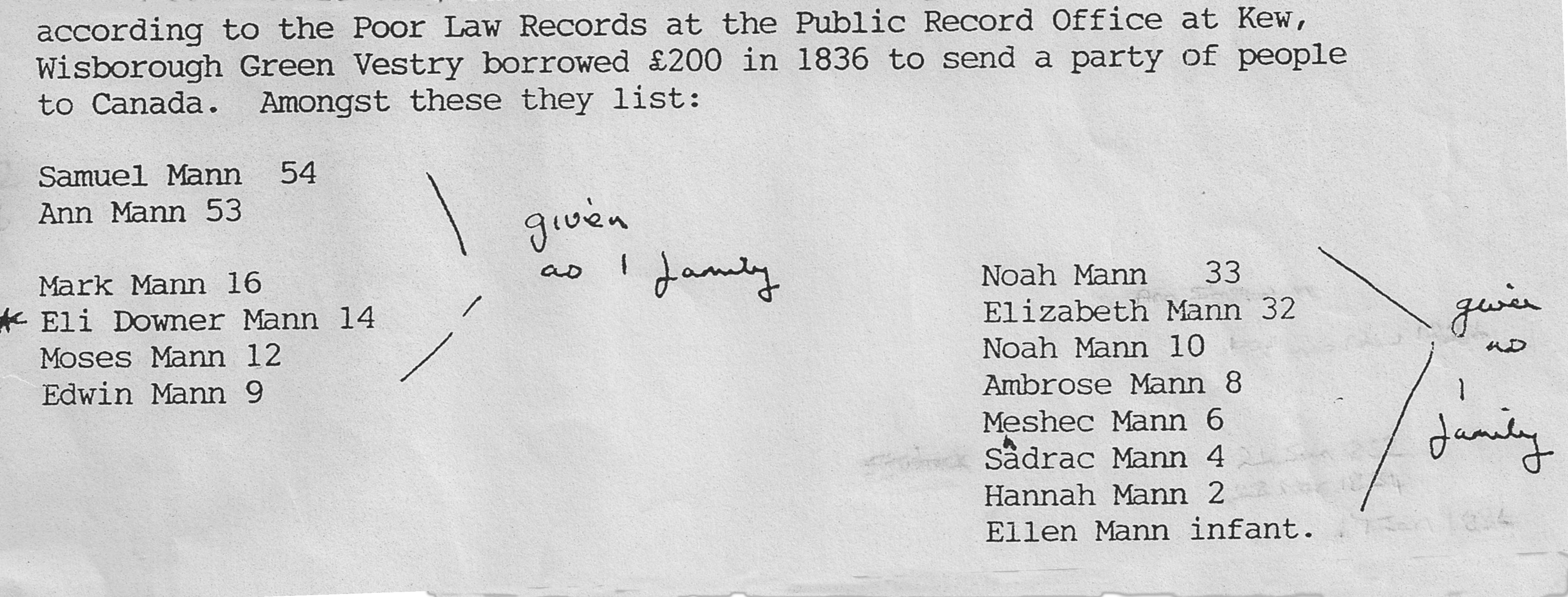 Also listed on that voyage were Noah's parents and four of his younger brothers: Samuel Mann (54) Elizabeth Mann (53) Mark Mann (16) Eli Downer Mann (14) Moses Mann (12) Edwin Mann (9). The family came on the ship Heber, A1, 441 tons; master Captain Rue; superintendent appointed by the Petworth Emigration Committee: James Marr Brydone; sailed from Portsmouth (Spithead) 28 April 1836; arrived at Quebec 5 June 1836/Quebec, Canada.
