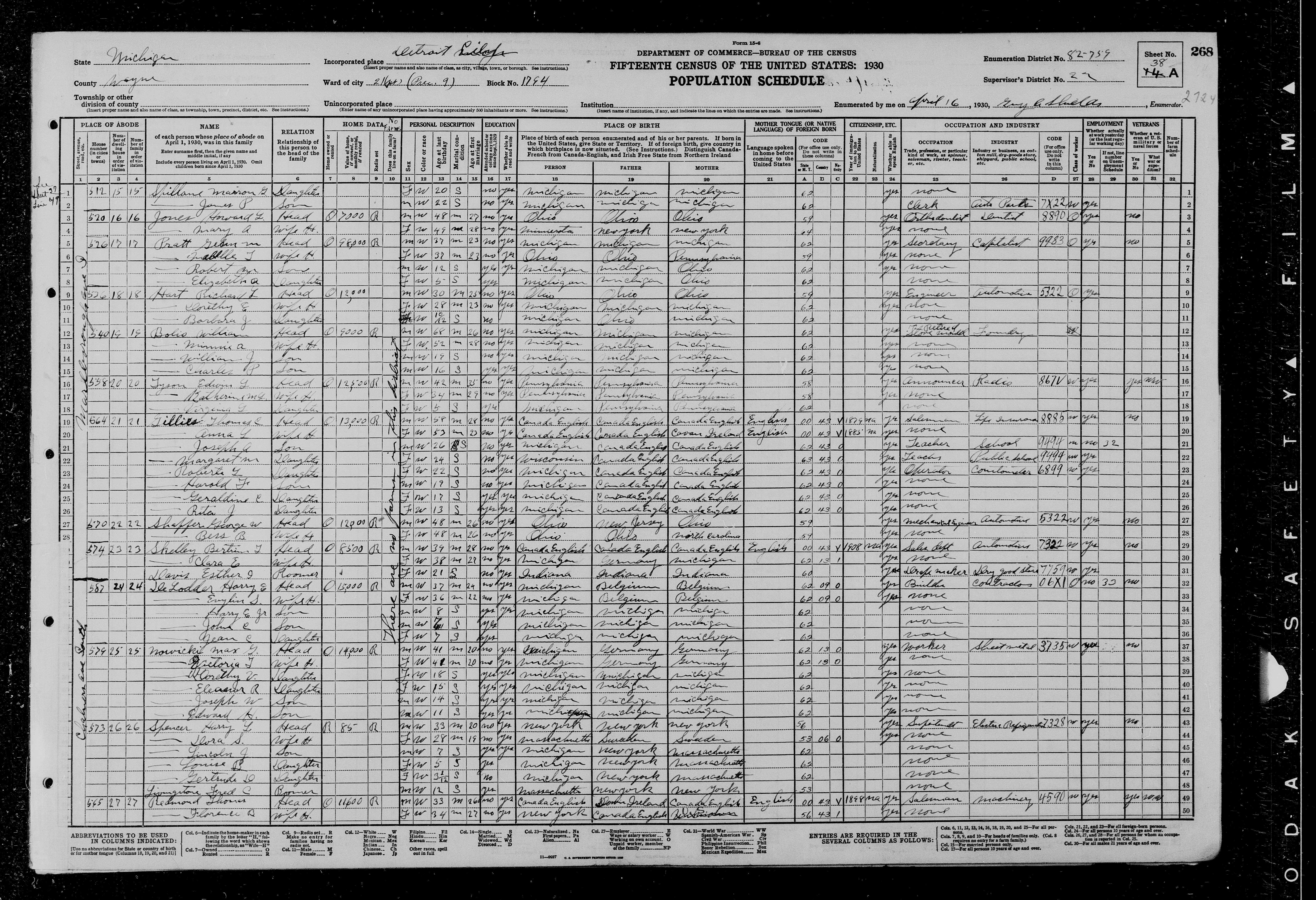 6. He appeared on the 1930 United States census on 16 April 1930 in Detroit, Wayne, Michigan, United States. This event was shared with Catherine M. LUKENBACH (1895-1993) and Virginia L. TYSON (1925-). 7. He resided at 558 Marlborough Lane, Detroit, Michigan on 16 April 1930 in Detroit, Wayne, Michigan, United States. This event was shared with Catherine M. LUKENBACH (1895-1993) and Virginia L. TYSON (1925-). 8. He had a residence in 1935 in Detroit, Wayne, Michigan, United States. 420