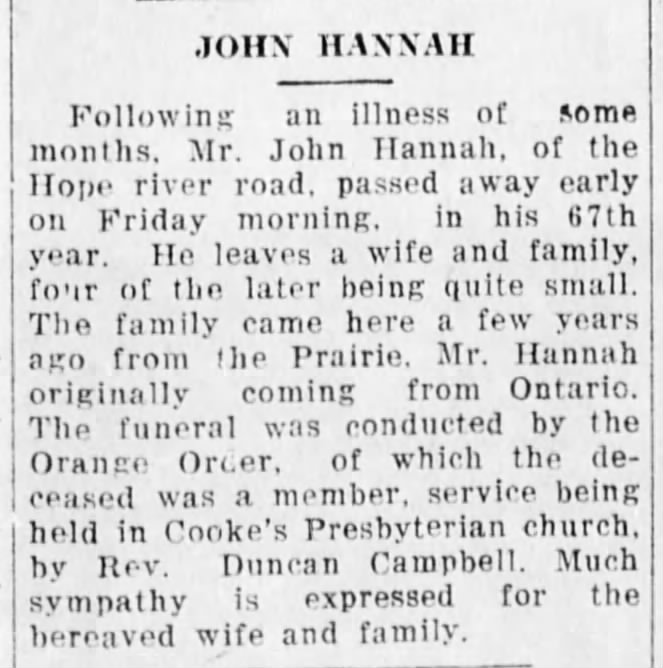 1. His obituary was published in The Chilliwack Progress, Page 1 on 3 January 1924 in Chilliwack, , British Columbia, Canada. John married Catherine Elliott GRIEVE, daughter of William GRIEVE and Agnes FAIRBAIRN, on 14 December 1887 in Riverside, , Manitoba, Canada.379 (Catherine Elliott GRIEVE was born on 6 December 1861 in Chatham, Kent, Ontario, Canada 47 and died on 28 October 1918 in Boissevain, , Manitoba, Canada 379.) John next married Mary Spafford HENDERSON on 21 January 1920 in , Riverside, Manitoba, Canada.1417 (Mary Spafford HENDERSON was born on 10 November 1897 in Turtle Mountain, , Manitoba, Canada,1417 died on 5 May 1984 in Killarney, , Manitoba, Canada 1417 and was buried in Killarney, , Manitoba, Canada 1417.) |