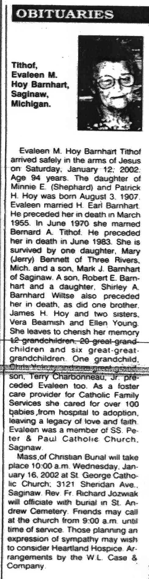 3. Her obituary was published in the Saginaw News on 15 January 2002 in Saginaw, Saginaw, Michigan, United States. Saginaw News Obituary - Evaleen Barnhart Tithof - Dated 1/15/2002. Evaleen married Bernard A. TITHOF in June 1970. (Bernard A. TITHOF died in 1983.) Evaleen next married Henry Earl BARNHART. (Henry Earl BARNHART was born on 17 October 1903 in Maple Grove, Muskegon, Michigan, United States, died on 30 September 1955 in Saginaw, Saginaw, Michigan, United States and was buried in October 1955 in Saginaw, Saginaw, Michigan, United States.) |