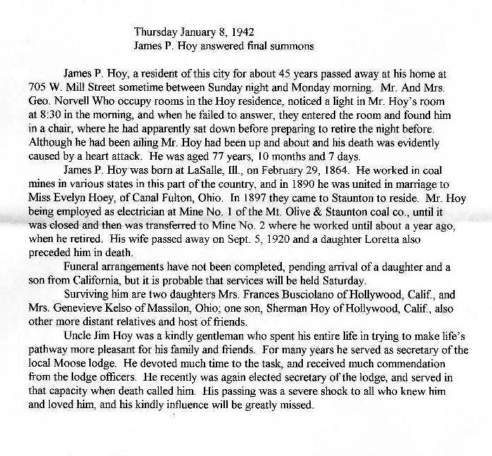 1. His obituary was published on 8 January 1942 in Staunton, Macoupin, Illinois, United States. James P Hoy answered final summons