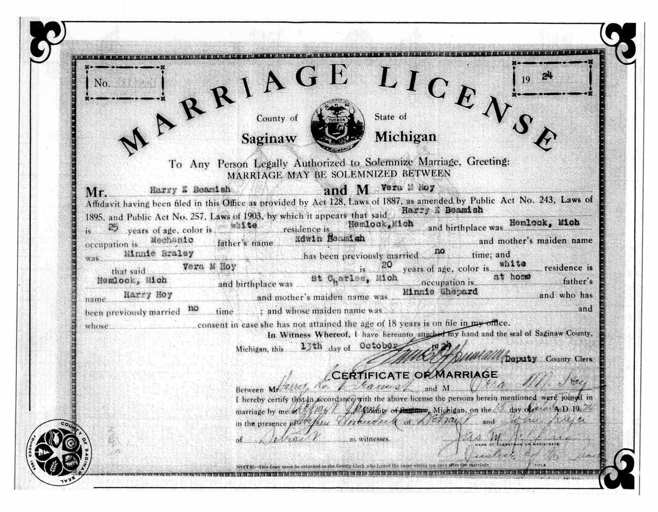 1. Harry and Vera obtained a marriage license on 13 October 1924 in Detroit, Wayne, Michigan, United States.