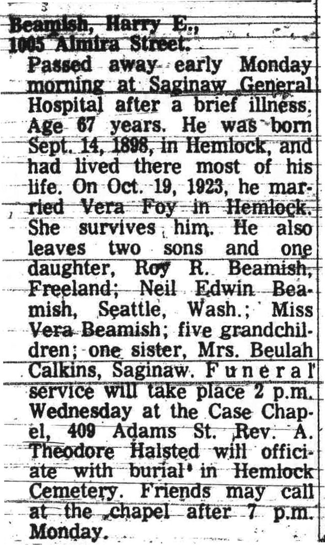 Passed away early monday morning at Saginaw General Hospital after a brief illness. Age 67 years. He was born Sept. 14, 1898, in Hemlock and had lived there most of his life. On Oct 19, 1923, he married Vera Foy in Hemlock. She survives him. He also leaves two sons and one daughter, Roy R. Beamish, Freeland: Neil Edwin Beamish, Seattle, Wash.; Miss Vera Beamish; five grandchildren; one sister, Mrs. Beulah Calkins, Saginaw. Funeral service will take place 2 p.m. Wednesday at the Case Chapel, 409 Adams St. Rev. A. Theodore Halsted will officiate with burial in Hemlock Cemetery. Friends may call at the chapel after 7 p.m. Monday.