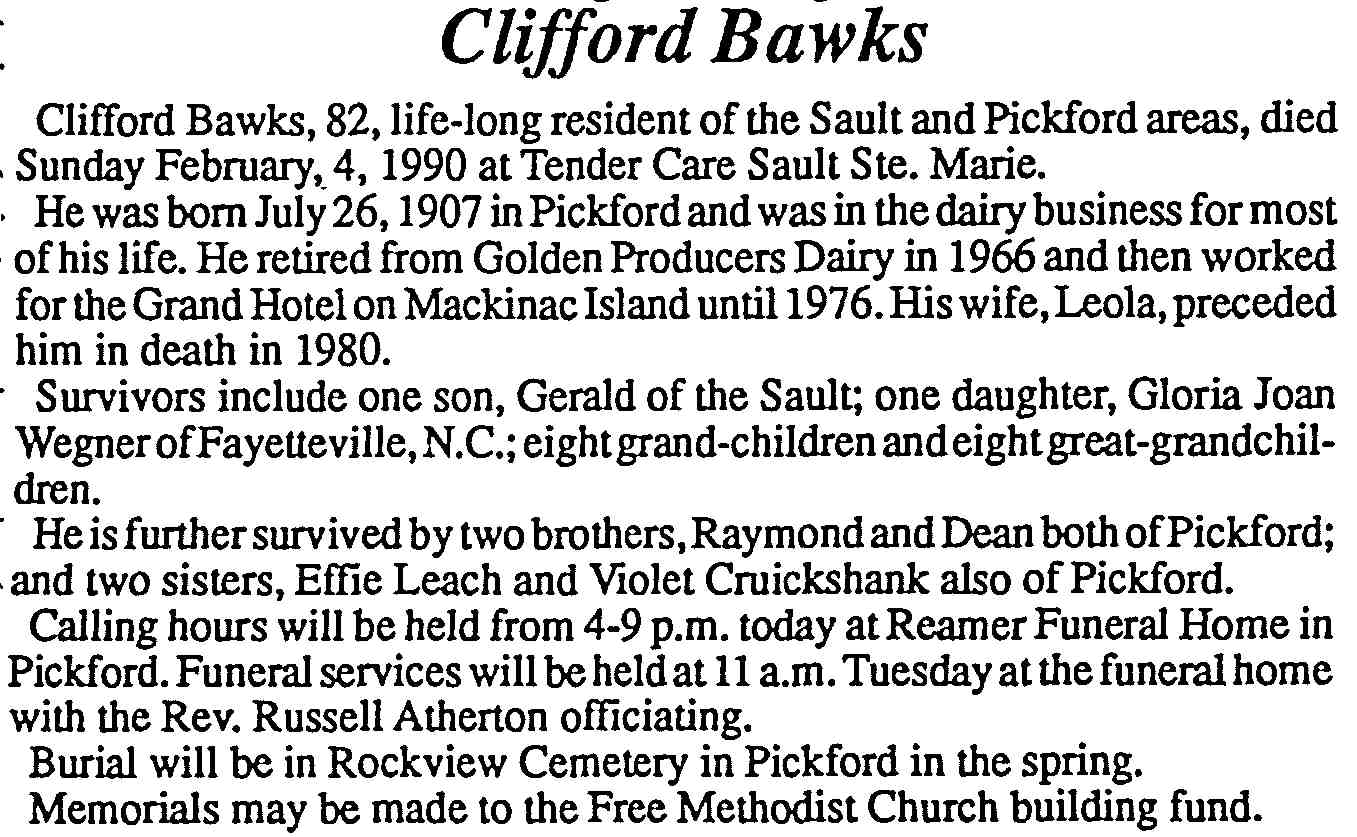 8. His obituary was published in the Soo Evening News on 5 February 1990 in Sault Ste. Marie, Chippewa, Michigan, United States. Clifford married Leola PENNINGTON, daughter of Charles Albert PENNINGTON and Mary Jane DUNN, on 26 December 1931 in Sault Ste. Marie, Chippewa, Michigan, United States.236 (Leola PENNINGTON was born on 13 September 1905 in Pickford, Chippewa, Michigan, United States,237 died on 3 April 1980 in Pentland Township, Luce, Michigan, United States 238 and was buried in April 1980 in Rockview, Mackinac, Michigan, United States.) Marriage Notes: Robert E. Nicholls, Baptist Minster presided over the ceremony. Witnesses were Raymond Bawks and Doris Pennington. Clifford was 24 years of age at the time of the marriage. Leola was 25. |