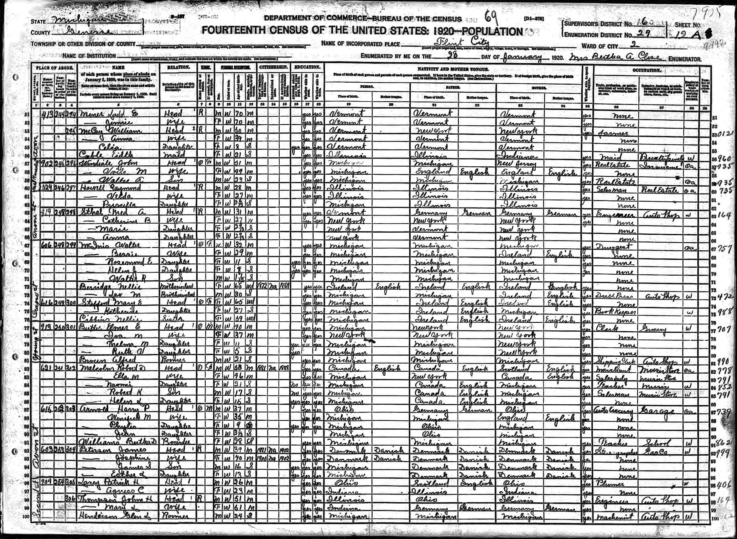 7. He appeared on the 1920 United States census on 2 January 1920 in Flint, Genesee, Michigan, United States. This event was shared with Agnes Cecila THOMPSON (-1962).