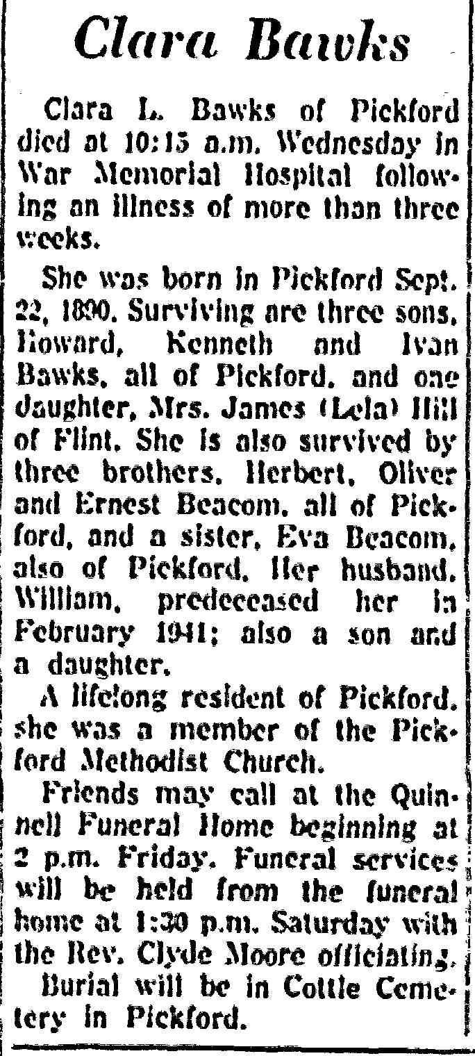 1. Her obituary was published. Clara married William George BAWKS, son of Robert BAWKS and Isabella GRAHAM, on 11 June 1913 in Sault Ste. Marie, Chippewa, Michigan, United States.572 (William George BAWKS was born in April 1887 in Caledonia, Kent, Michigan, United States,121 died on 20 February 1941 in Howell, Livingston, Michigan, United States and was buried in 1941 in Pickford, Chippewa, Michigan, United States.) |