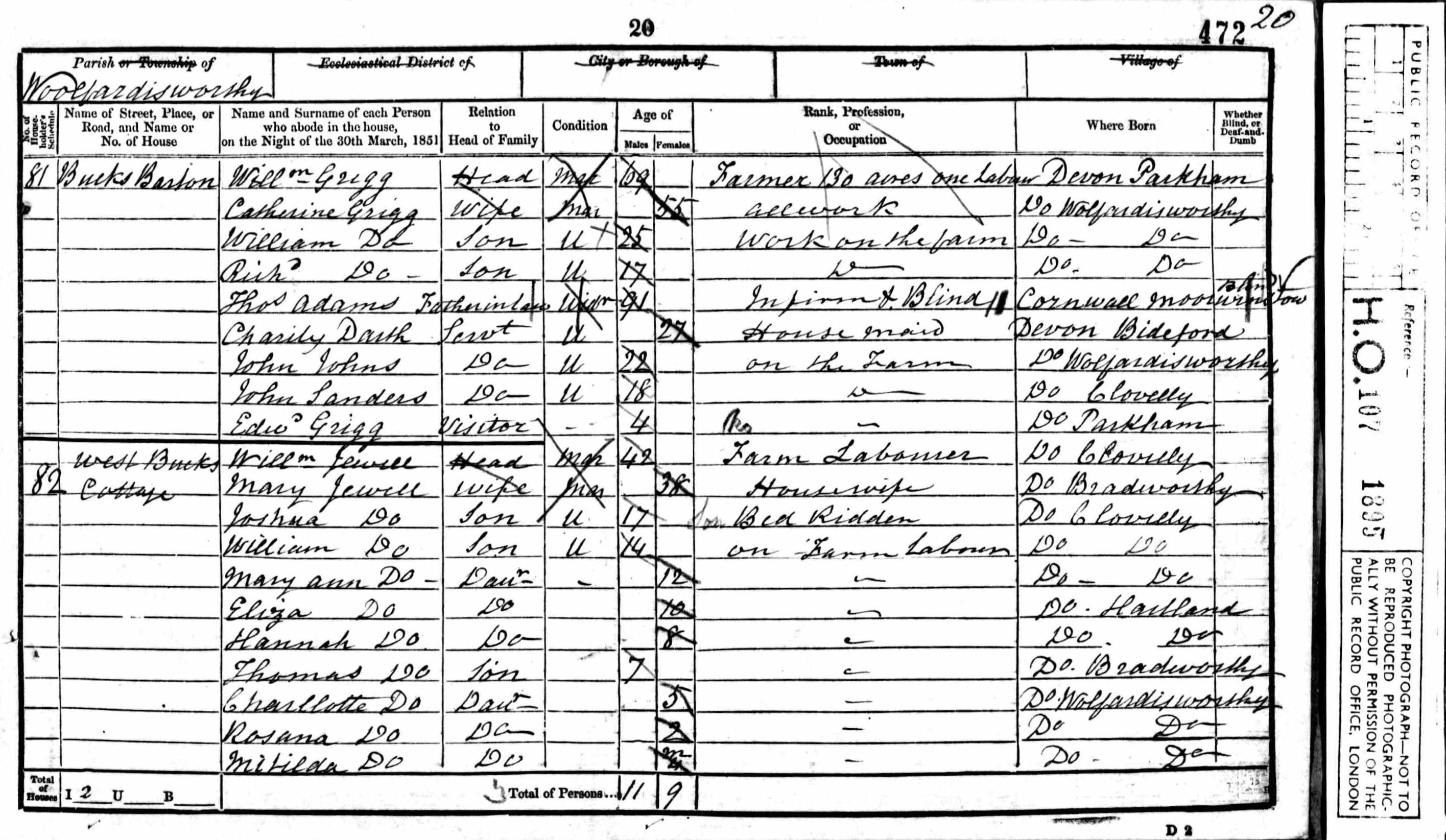 2. Census: 1841 British, on 6 June 1841, in Woolfardisworthy, , Devonshire, England. This event was shared from William GRIGG who also shared it with Ann GRIGG (1823-After 1901), Catherine ADAMS (1796-1885), Enoch GRIGG (1827-1907), John GRIGG (1830-), Richard GRIGG (1833-), Seth GRIGG (1835-1920), Thomas ADAMS (1760-1855), and William GRIGG (Abt 1824-1885). 3. Thomas was an occupant at the residence of William GRIGG on 6 June 1841 in Woolfardisworthy, , Devonshire, England: Buckish Barton. This event was shared from William GRIGG who also shared it with Ann GRIGG (1823-After 1901), Catherine ADAMS (1796-1885), Enoch GRIGG (1827-1907), John GRIGG (1830-), Richard GRIGG (1833-), Seth GRIGG (1835-1920), Thomas ADAMS (1760-1855), and William GRIGG (Abt 1824-1885).