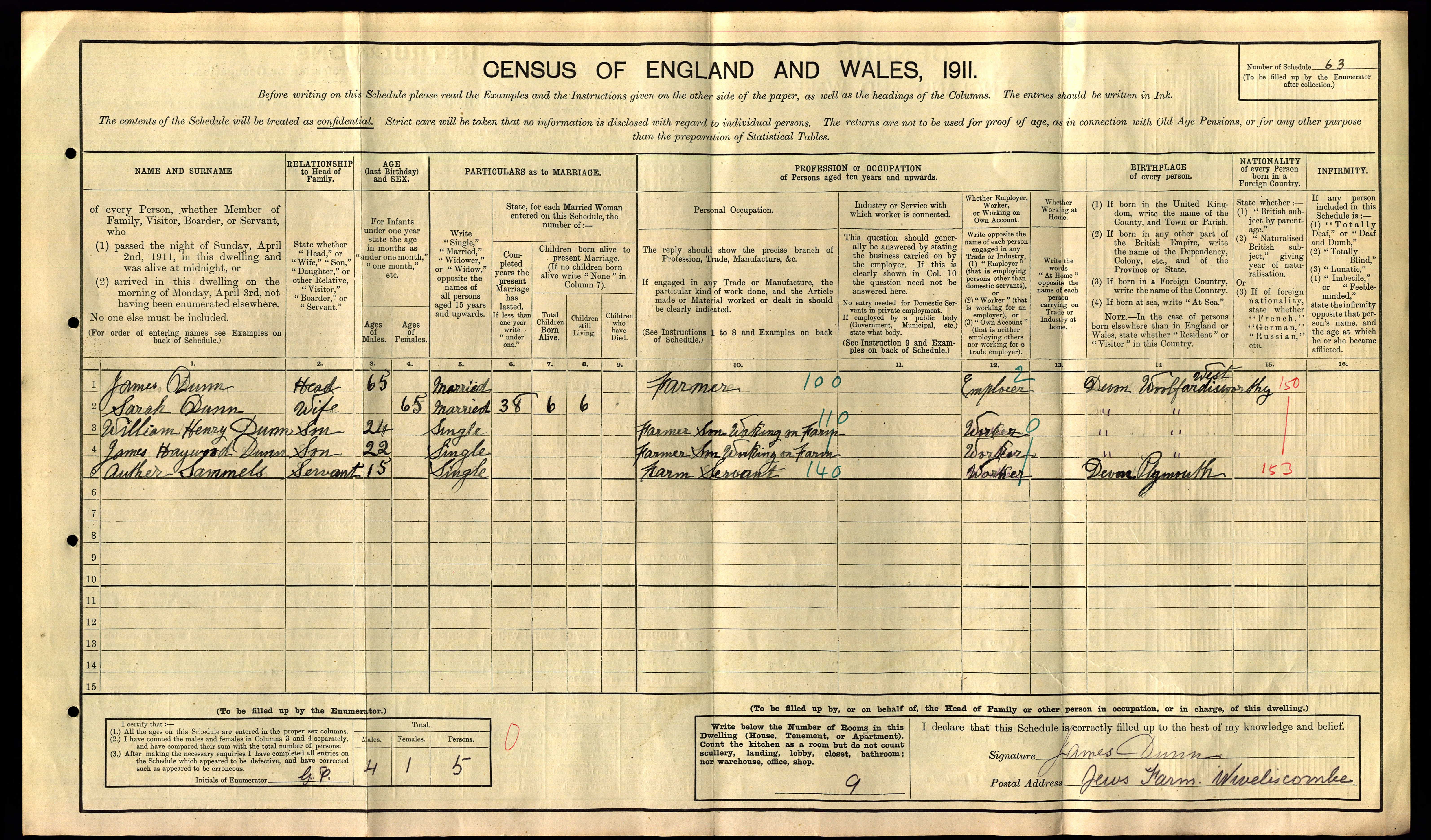 5. William appeared in the household of James DUNN in the 1911 British census on 2 April 1911 in Wiveliscombe, , Somerset, England. This event was shared from James DUNN who also shared it with James Heywood DUNN (Abt 1889-), Sarah HEYWOOD (Abt 1847-), and William Henry DUNN (Abt 1887-). |