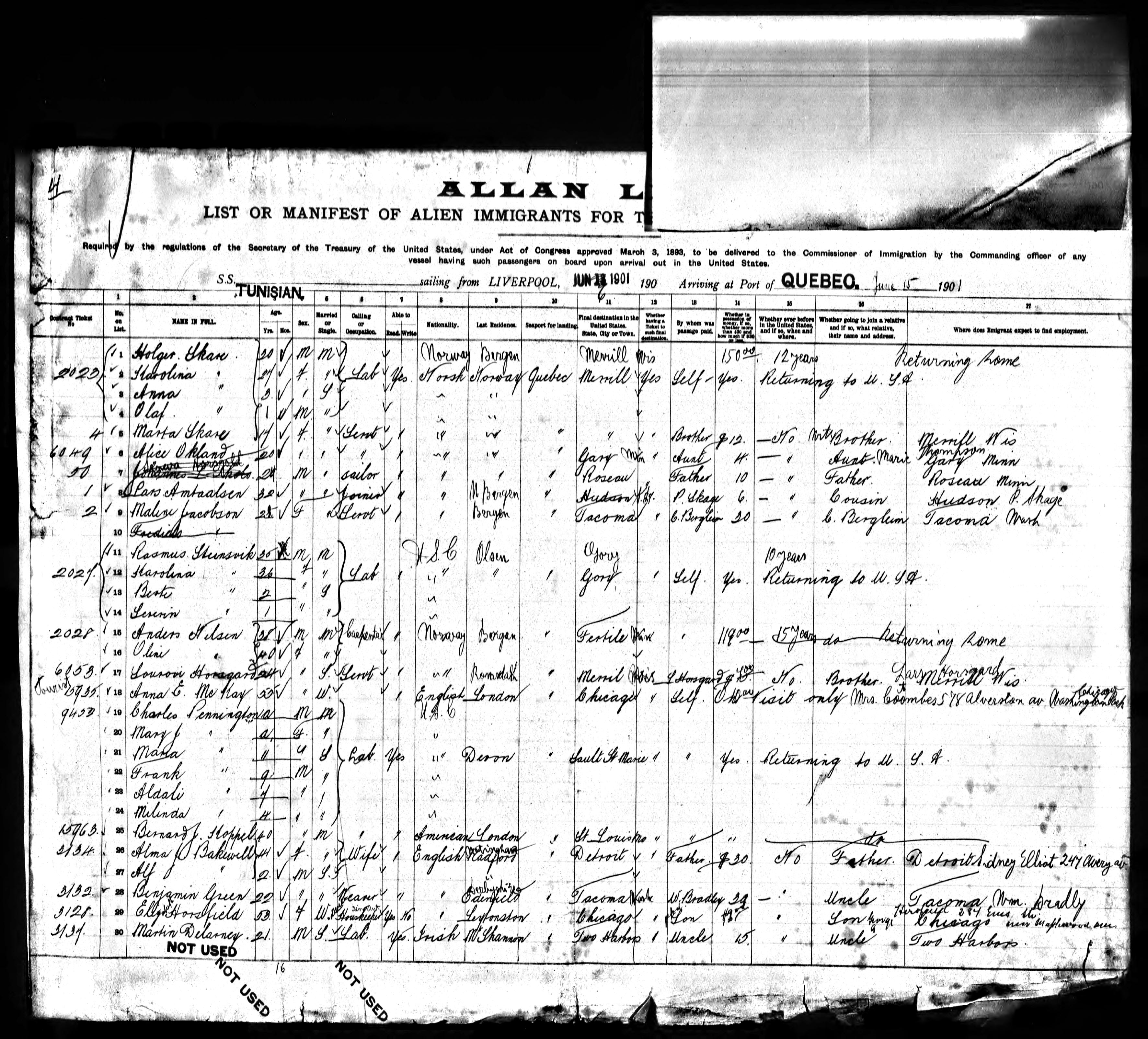 Arrival in Quebec was on 15 Jun 1901.
