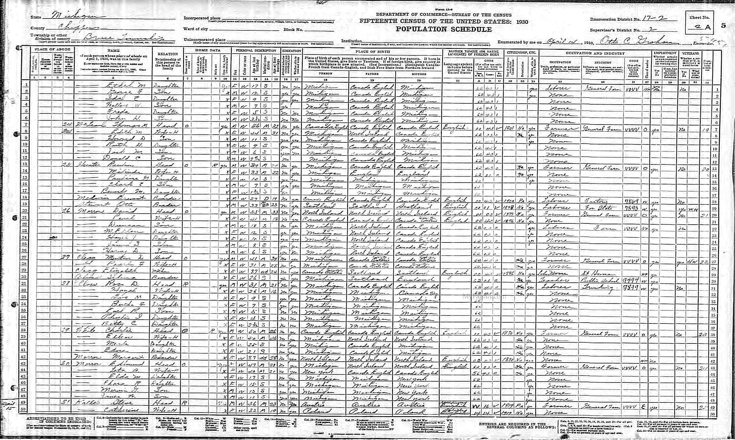 Name Rueben Hunter Event Type Census Event Date 1940 Event Place Bruce Township, Chippewa, Michigan, United States Gender Male Age 50 Marital Status Married Race (Original) White Race White Relationship to Head of Household (Original) Head Relationship to Head of Household Head Birthplace Michigan Birth Year (Estimated) 1890 Last Place of Residence Same Place Household Role Gender Age Birthplace Rueben Hunter Head M 50 Michigan Melinda Hunter Wife F 43 Michigan Clark Hunter Son M 17 Michigan Beverly Hunter Daughter F 11 Michigan Donna Mae Hunter Daughter F 8 Michigan Charles Hunter Son M 6 Michigan Marilyn Hunter Daughter F 4 Michigan Shirley Hunter Daughter F 2 Michigan Bruce, Chippewa, Michigan, United States. This event was shared from Reuben HUNTER who also shared it with Beverly Marie HUNTER (1928-2018), Charles William HUNTER (1934-2002), Clark Everet HUNTER (1922-1999), Donna Mae HUNTER (1931-), Marilyn Joan HUNTER (1936-), Melinda PENNINGTON (1895-1990), and Shirley Jean HUNTER (1938-2013).